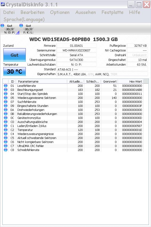 Ich habe die Platte nach Defekten Sektoren durchsucht, alles OK. Auch bis jetzt noch keine