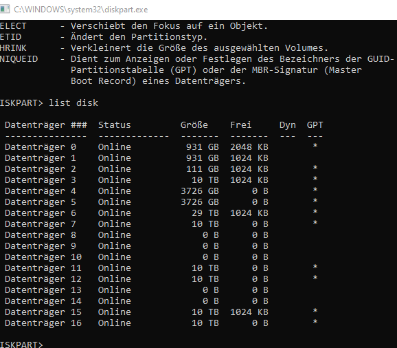 Auch diskpart erkennt die Festplatten, jedoch auch hier die Fehlermeldung "Fehler der Anforderung aufgrund eines schwerwiegenden Hardware Fehlers".