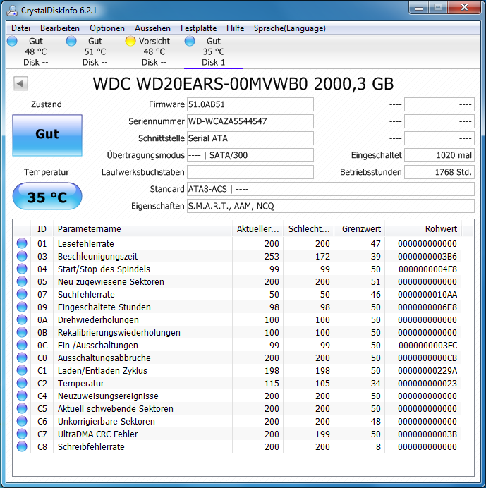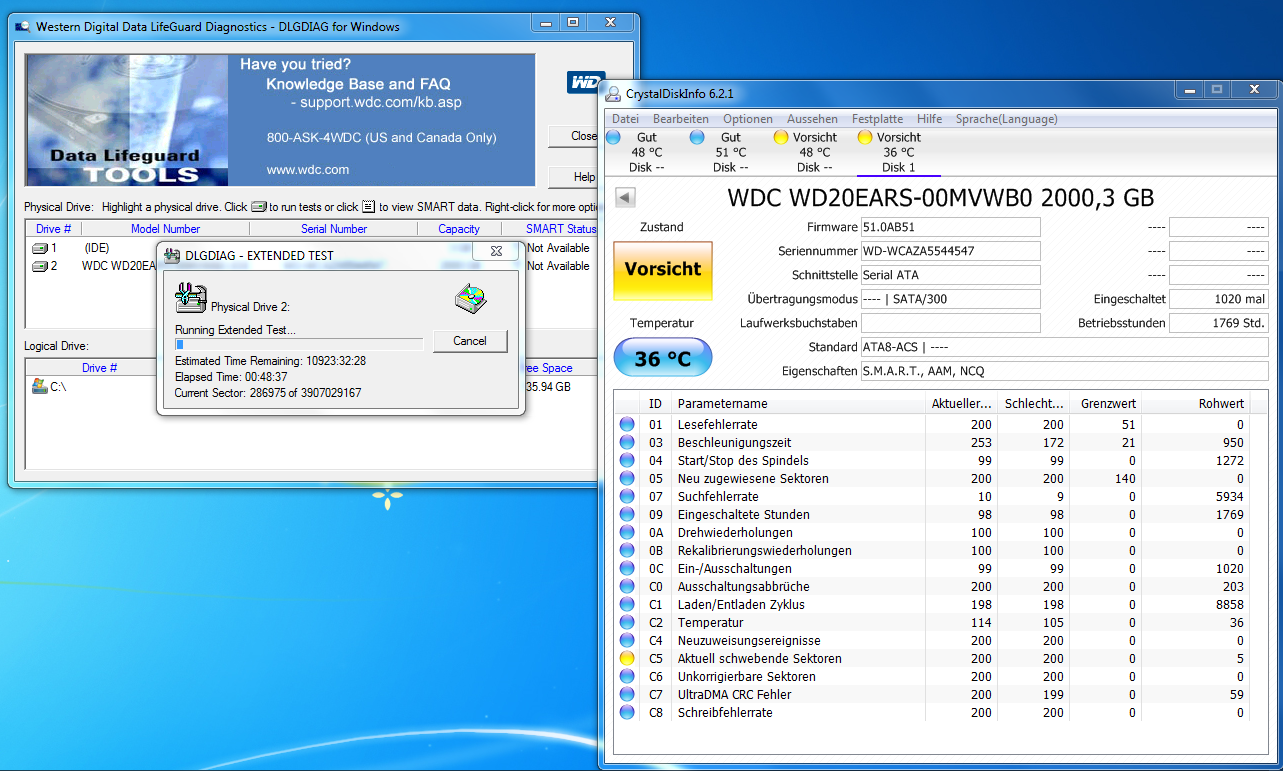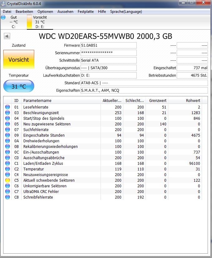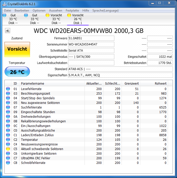 Die Smartwerte lassen sich noch auswerten, waren aber unauffällig (siehe Screenshot). Habe dann mal das Tool von WD benutzt, ein extendet Test angeworden, dieser bricht mit dem Hinweise ab "to many bad sectors". Danach nochmal die Smartwerte geprüft und diese wiesen dann "schwebende Sektoren" auf (siehe Screenshot). Auch an einem anderen PC die gleichen Ergebnisse. Ist die Platte hinüber oder kann man hier nochwas machen?