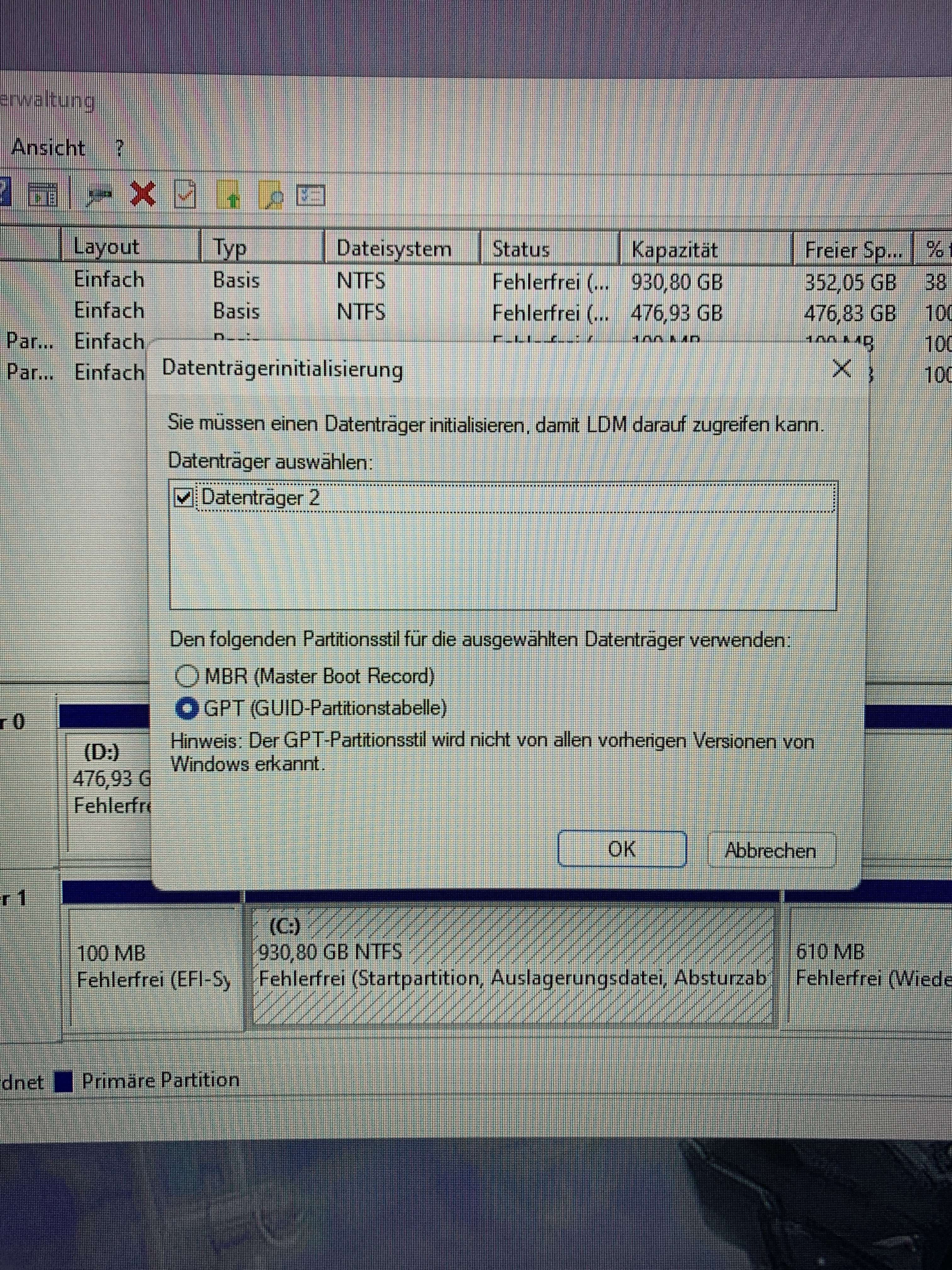 bekommen. Da ich genug Speicher an meinem Pc habe wollte ich diesen als Speicher für meine Xbox nehmen. Dieser wird nicht von meiner Xbox erkannt, aber von meinem Pc unter der Datenträgerverwaltung und unter Aomei erkannt. In der Datenträgerverwalung wird mir angezeigt, dass ich ihn initialisieren muss. Als ich versucht habe das zu tun kam die Fehlermeldung: „Zugriff verweigert“ ( Siehe Bilder).