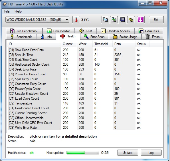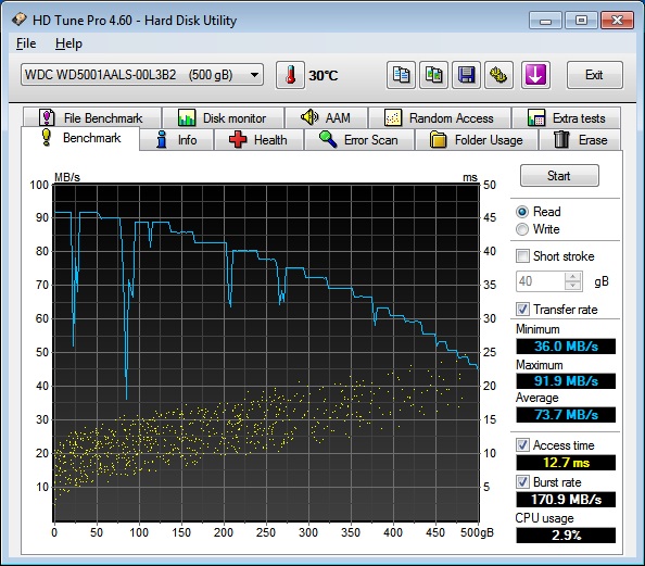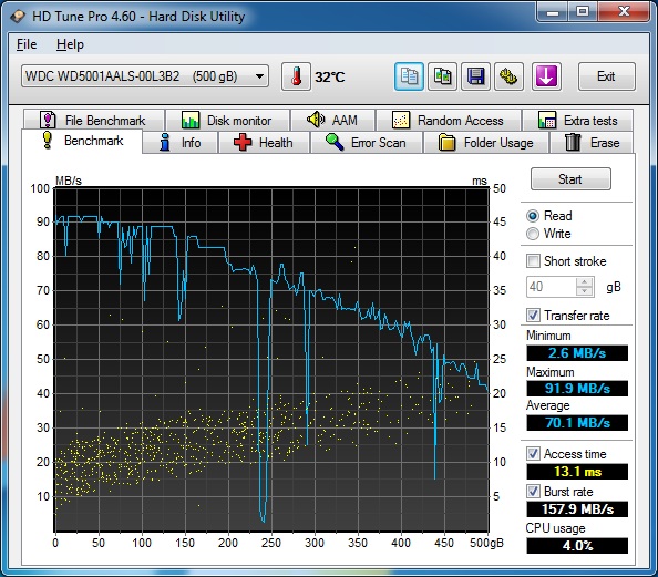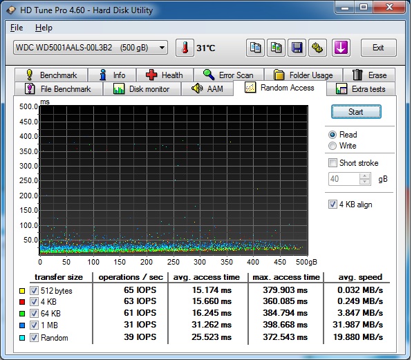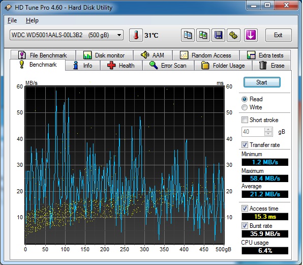 mir ist in letztzer Zeit aufgefallen dass mein System sehr langsam geworden ist, jedoch ohne viele Laufende Programme / Prozesse und minimaler CPU Auslastung. Desweiteren ist mir heute beim verschieben einer Datei auf eine andere Partition der der gleichen Platte aufgefallen dass ich nur eine Übertragungsrate von 17 MB/s erreiche. Daraufhin habe ich dann mal HDTune bemüht und die Werte kommen mir doch sehr eigenartig vor. Könnt ihr mir sagen ob das so richtig ist oder ob etwas mit der Platte nicht stimmt? Kann es andere Gründe hierfür geben außer einer defekten Platte?