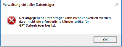 In der Datenträgerverwaltung scheint diese als "Nicht initialiasiert" auf (logisch, ist ja nagelneu) und bekomme direkt die Dialogbox für den Vorgang. GPT direkt ausgewählt wegen der 3TB aber nach der Bestätigung kommt direkt eine Fehlermeldung
