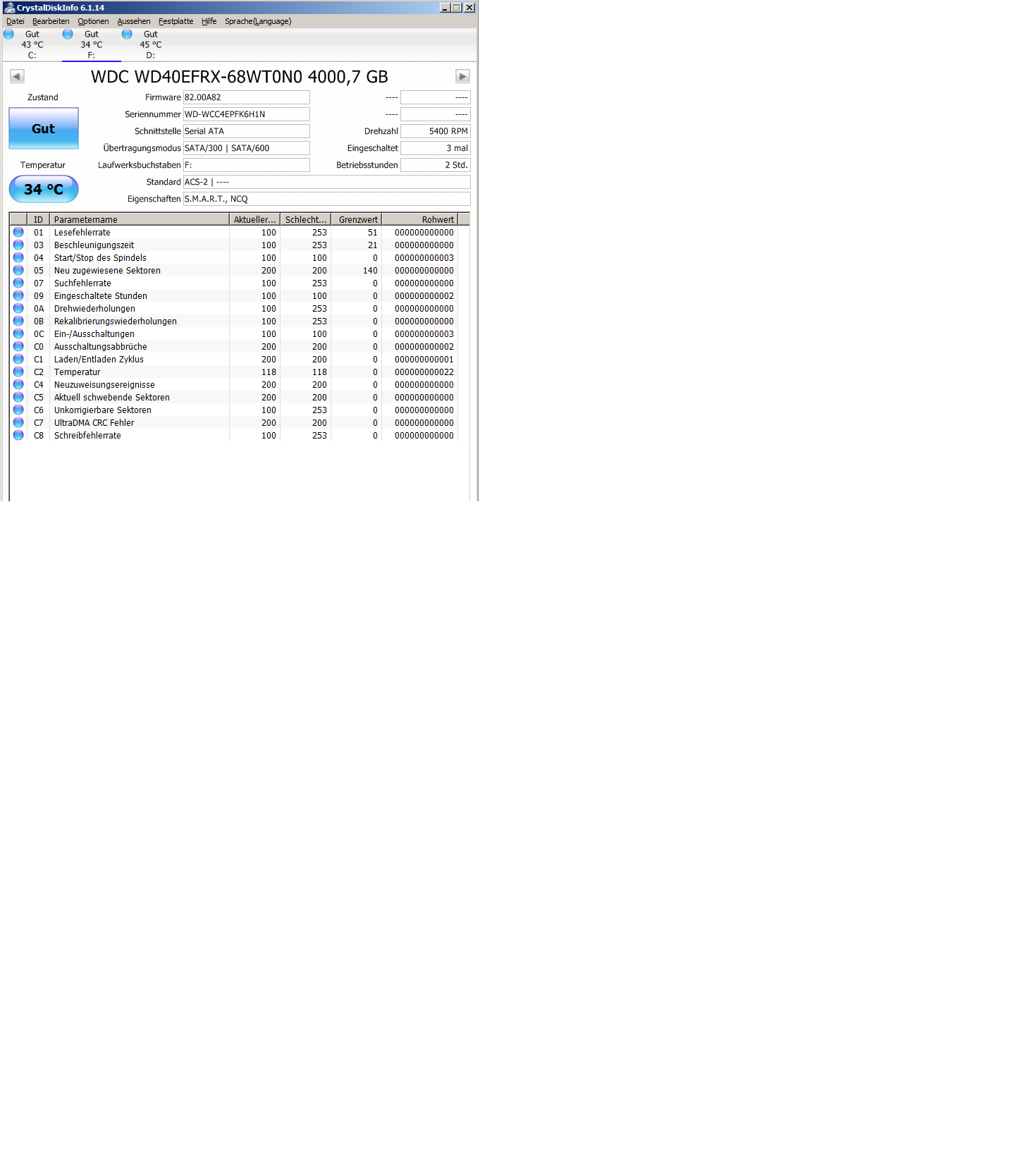 Ich habe danach noch HD-Tune auprobiert (Die Festplatte wird als 2Tb erkannt? - aber keine Probleme gemeldet)