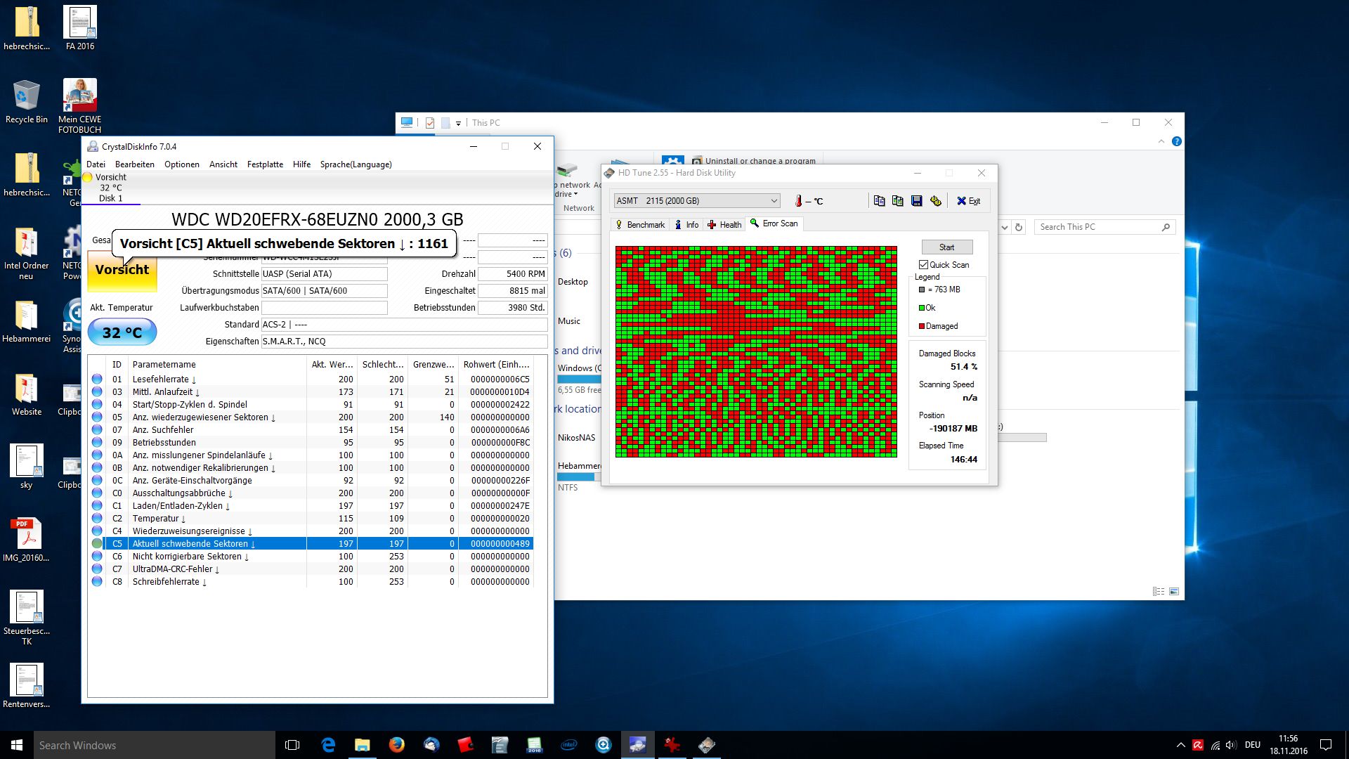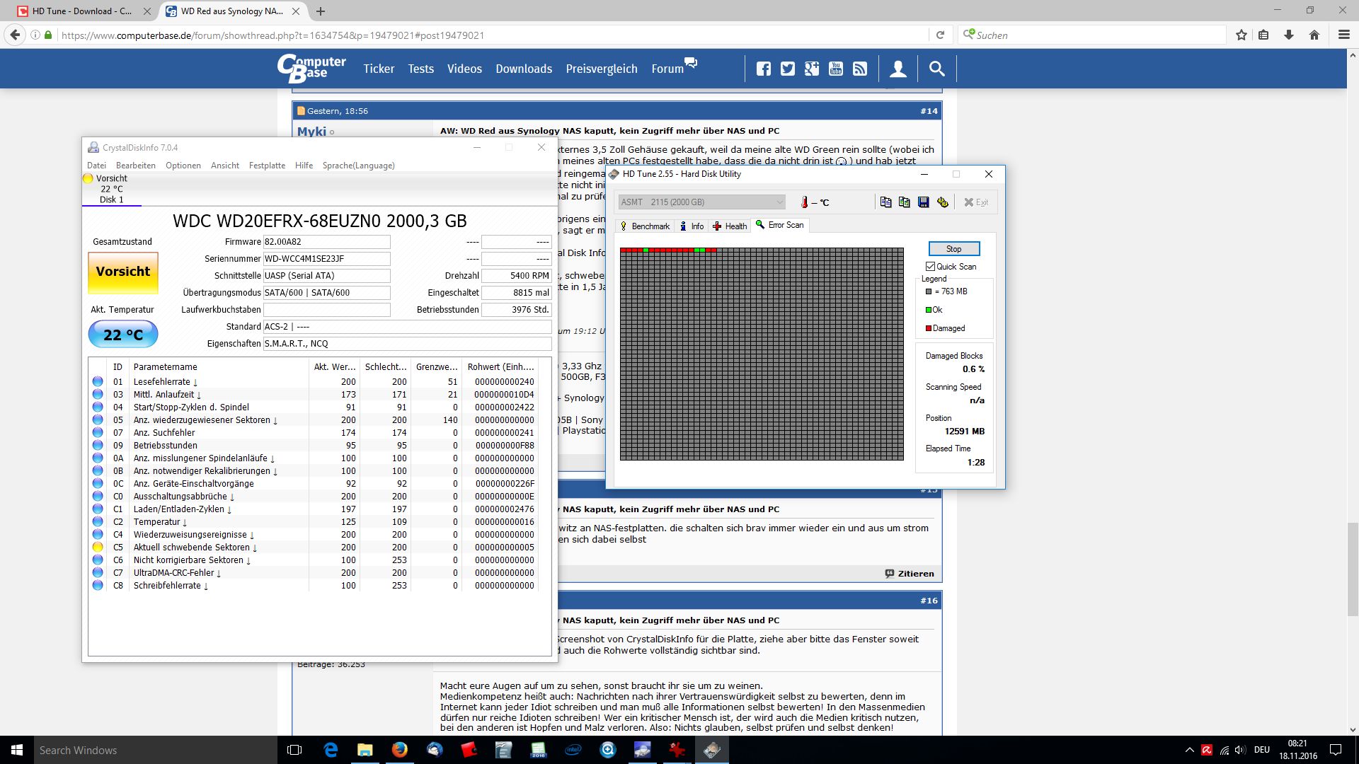 vorgestern ist meine WD Red 2TB aus meinem 215j verreckt. Das NAS erkennt die Platte weder in Slot 1, noch 2, weder im Einzelberieb noch im Verbund mit der zweiten Red. Hab die Platte in ein zweites NAS gesteckt und auch in einen PC eingebaut, aber im NAS wird sie nicht erkannt und im UEFI des PC auch nicht, außerdem fährt der PC gar nicht richtig hoch und auch ins UEFI zu kommen dauerte sehr lange. Die Red ist 1,5 Jahre alt, dürfte ca. 3700 Stunden drauf haben (das hat die andere Red zumindest, beide liefen im RAID 1) und es besteht noch Herstellergarantie bis 2018. Ich möchte allerdings die Daten von der Platte löschen, weil da sehr private und sensible Daten drauf sind, hat irgendjemand ein Idee was mit der Platte sein könnte und wie man drauf zugreifen könnte. Im PC ist sie übrigens angelaufen (vibriert) und im NAS leuchtete die Lampe des Synology kurzzeitig mal grün auf, allerdings konnte man nichtmal auf den Webassistenten zugreifen.