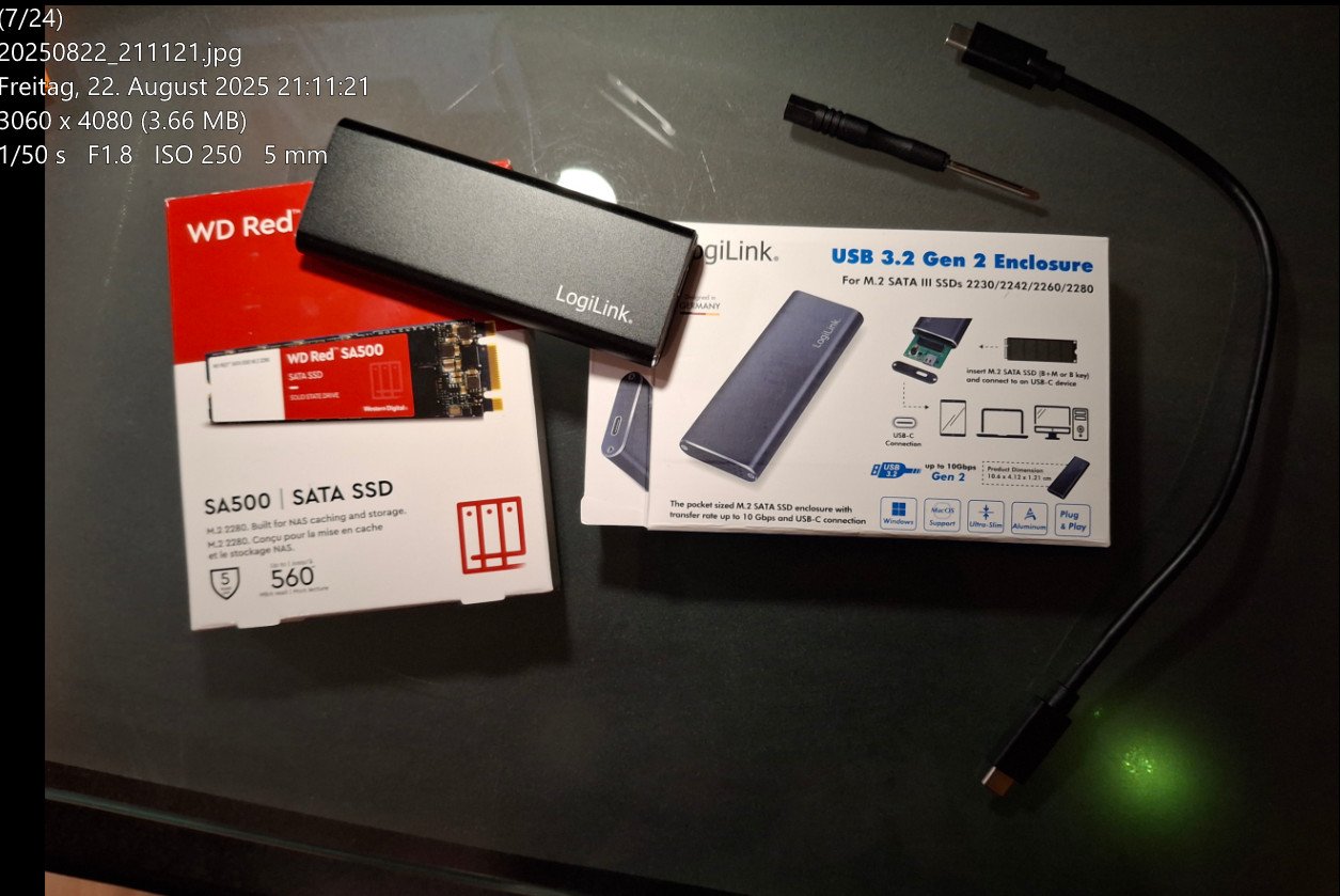 ich hab vor wenigen Wochen eine M.2 SSD (WD red 500GB) und ein externes Gehäuse (LogiLink USB 3.2 Gen enclosure für M.2 NGFF SSD) gekauft. Ich wollte eigentlich meine alte Toshiba SSD aus einem Gaming Laptop in dieses Gehäuse stecken. Vorübergehend habe ich einfach die neue WD Red dort eingebaut. Leider wird die SSD nicht erkannt. Das Gehäuse dagegen wird (scheinbar) erkannt.