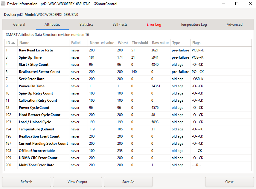 Raw Value ist z.B. nicht 0 und diese pre failure ist einfach nur eine Einordnung von GSmartControl nach der "Kritikalität" 🤣 wiederzugewiesene Sektoren sind nun mal ein ganz schlechtes Zeichen. Da brauchen wir nicht rumdiskutieren