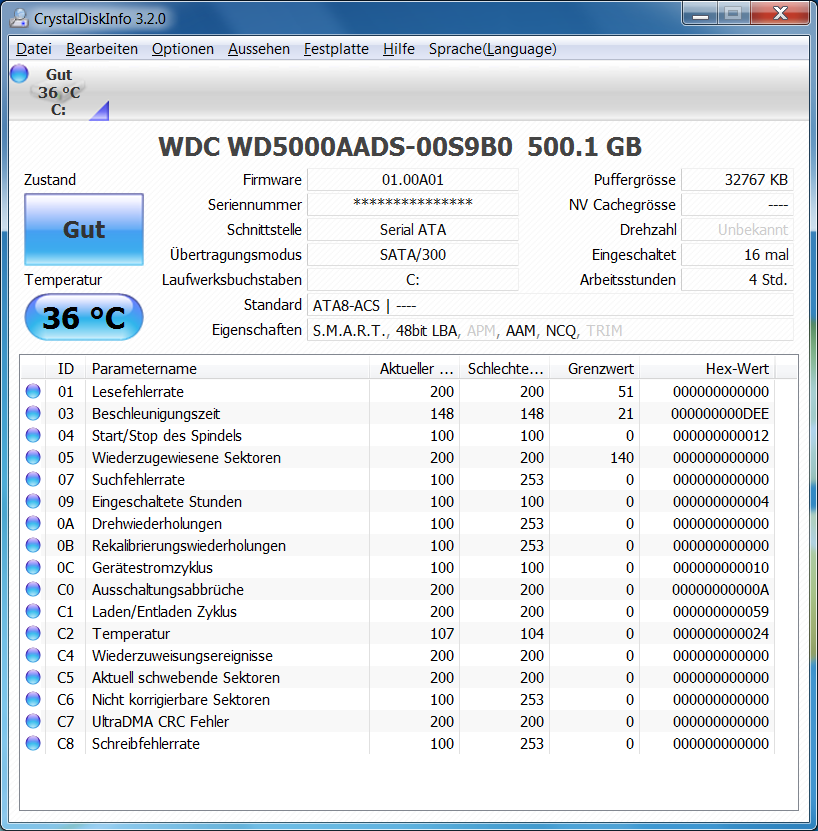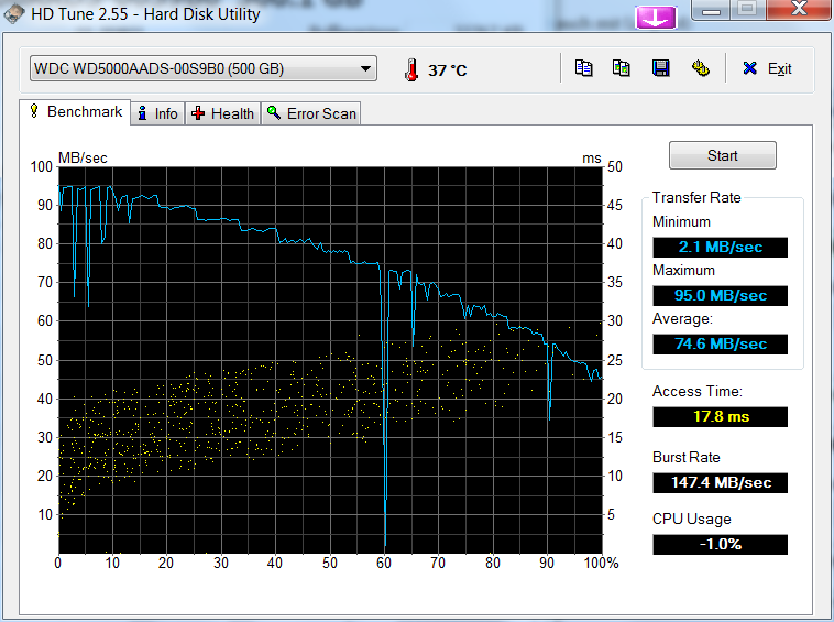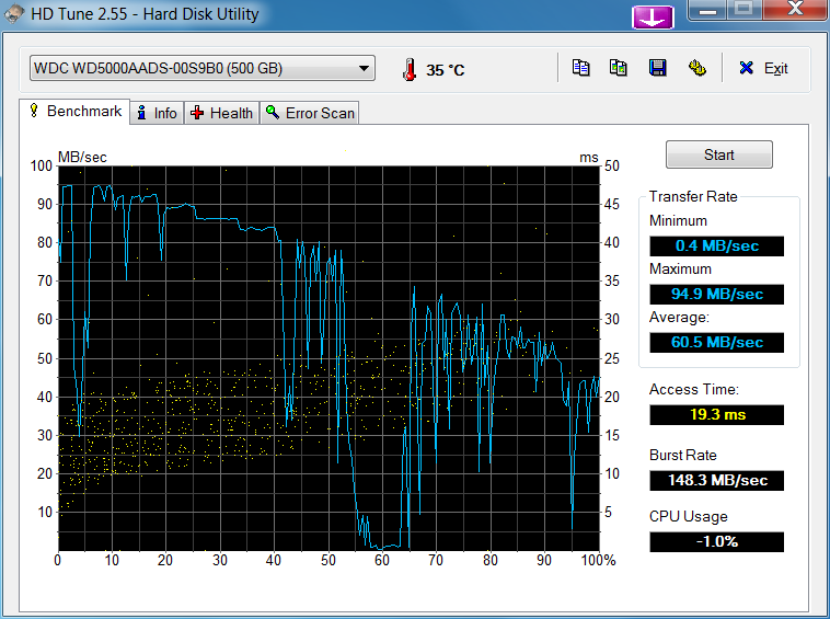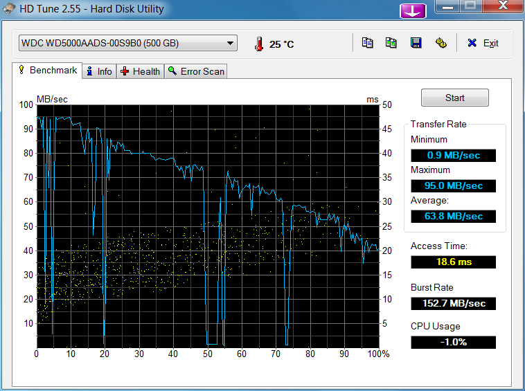 habe seit kurzem eine neue WD GreenPower 500 GB WD5000AADS. Sie zeigt nach einer frischen Win7 Installation bei praktisch jeder einfachen HD Tune Messung starke Einbrüche. Irgendwelche Hintergrundprogramme (Antivirensoftware usw.) laufen dabei nicht. Ausserdem erscheint mir die Zugriffszeit mit ca. 18 ms etwas zu hoch. Laut Windows 7 Leistungsindex erreicht sie erstaunlicherweise dennoch einen Wert von 5,9.
