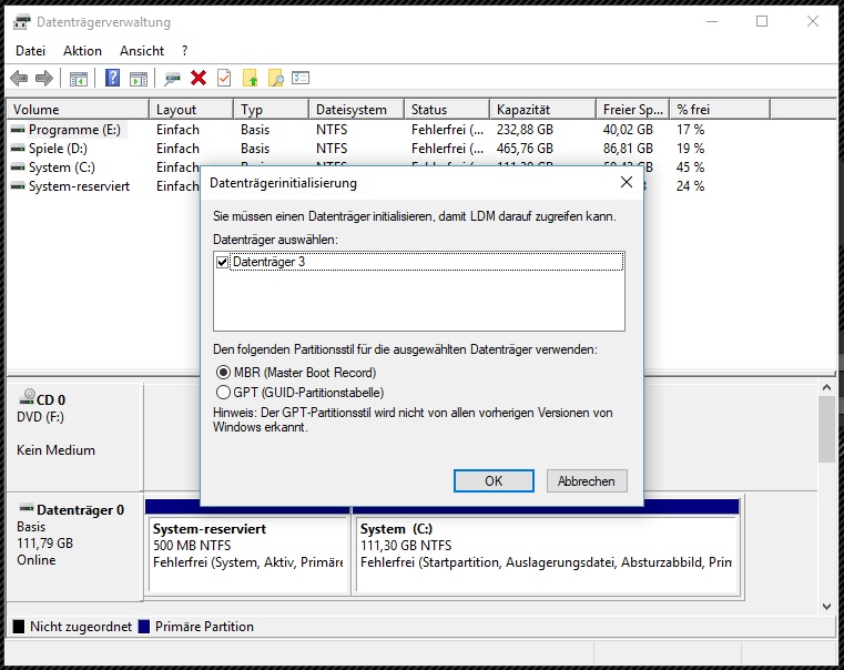Hallo ich habe eine 1 TB Festplatte (WD10EURX) noch und würde die auch Gerne für Spiele u.s.w. Benutzen nur das Problem ist die wird vom Bios (UEFI) erkannt aber von Windows 10 nicht was kann ich dagegen machen ?