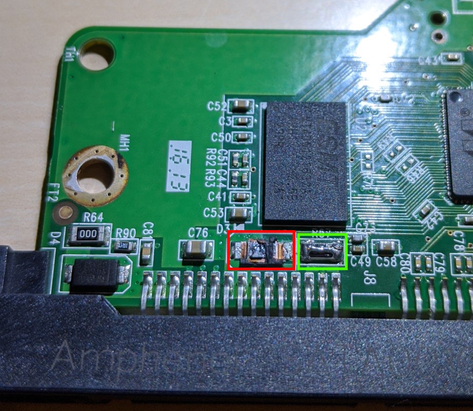 Leider keine guten Nachrichten, laut den Beiträgen in folgendem Forum hat Western Digital die Sicherung falsch designed (bzw. "conceptually shit"), sobald R64 bzw. R67 durchbrennt, ist die Elektronik ungeschützt (mich hat es schon gewundert, dass die 0 Ohm Widerstände am Stecker alle intakt sind): https://forum.hddguru.com/viewtopic.php?f=1&t=32303