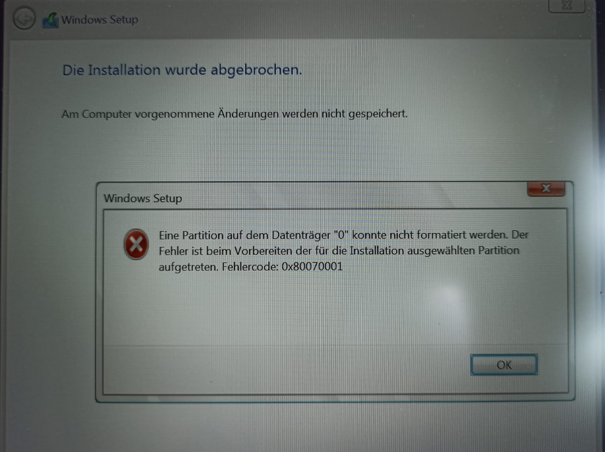 Wenn ich die intern in meinen Laptop anschließe, dann kann ich hier nicht einmal Win11 Pro installieren. Ich erhalte hier zB. eine Meldung: „Eine Partition auf dem Datenträger „0“ konnte nicht formatiert werden…“, Fehler in Diskpart: Ein nicht vorhandenes Gerät wurde angegeben…