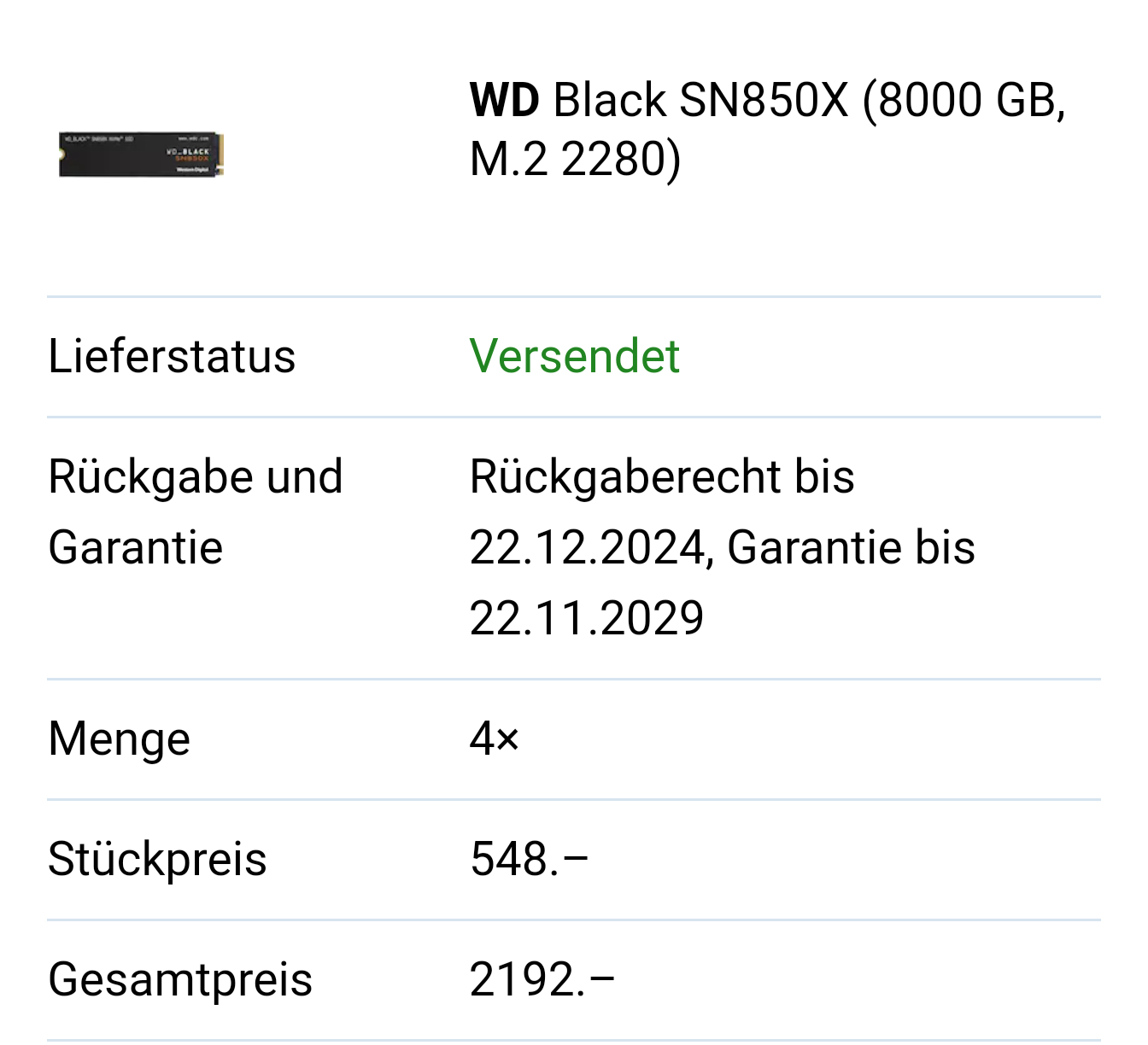 Ja schon was feines mit 8TB. ich habe mir aber erst mal meine erste 4TB gegönnt. Für 239€ auch ein akzeptabler Preis für mich. Da Ich noch weitere 2TB PCie 3 und 4 habe reicht mir der Platz erstmal für die nächsten Jahre aus im Gamer PC.