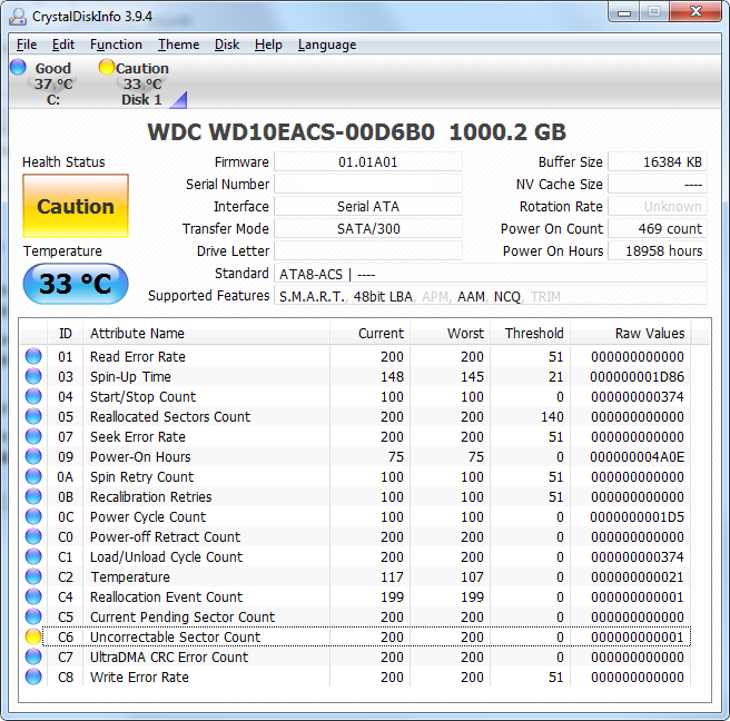 ich habe eine WDC WD10EACS - 1TB Festplatte im Gebrauch und bisher noch keine Probleme festgestellt. Habe aber nun das Tool CrystalDiskInfo mal installiert wo mir bei Zustand Vorsicht angezeigt wird, da eben 200 Unkorrigierbare Sektoren da sein.