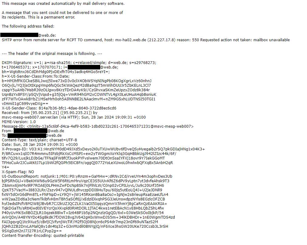 Als Testversuch habe ich von einem anderen Konto versucht mir auf meine Haupt-Emailadresse eine E-Mail zu senden mit dem Ergebnis, dass prompt eine "Mail delivery failed" zurück kam. Dies zeigt meiner Meinung nach ja bereits, dass durch irgendein Ereignis meine E-Mailadresse gelöscht wurde?