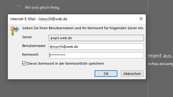 Kommt eine Fehlermeldung, wenn du im Fenster auf OK klickst bzw. beim Versuch E-Mails abzurufen (schau hierzu im Statusfenster.