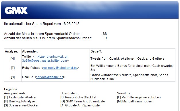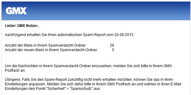 seit ca. 20.08.2013 bekomme ich sowohl über Web.de als auch über GMX für mich unbrauchbare Spamschutz-Emails.