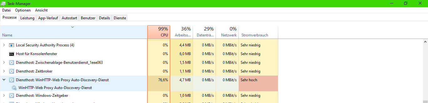seitdem ich das neue Windows 10 Update 20H2 installiert habe läuft gar nichts mehr dieser eine Dienst "Web proxy auto-discovery service" verbraucht eine extrem hohe CPU-Auslastung so dass dieser Dienst alleine 75% der CPU braucht ich habe am Anfang gedacht das legt sich wieder wenn ich ein paar Minuten warte letztendlich habe ich eine Stunde gewartet ohne dass sich was verändert hat dabei weiß ich noch nicht mal was das für ein Dienst ist der ununterbrochen so viel CPU Leistung verbraucht.