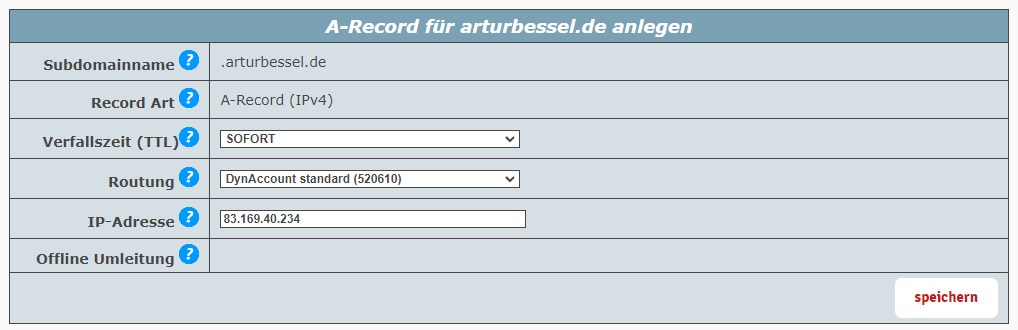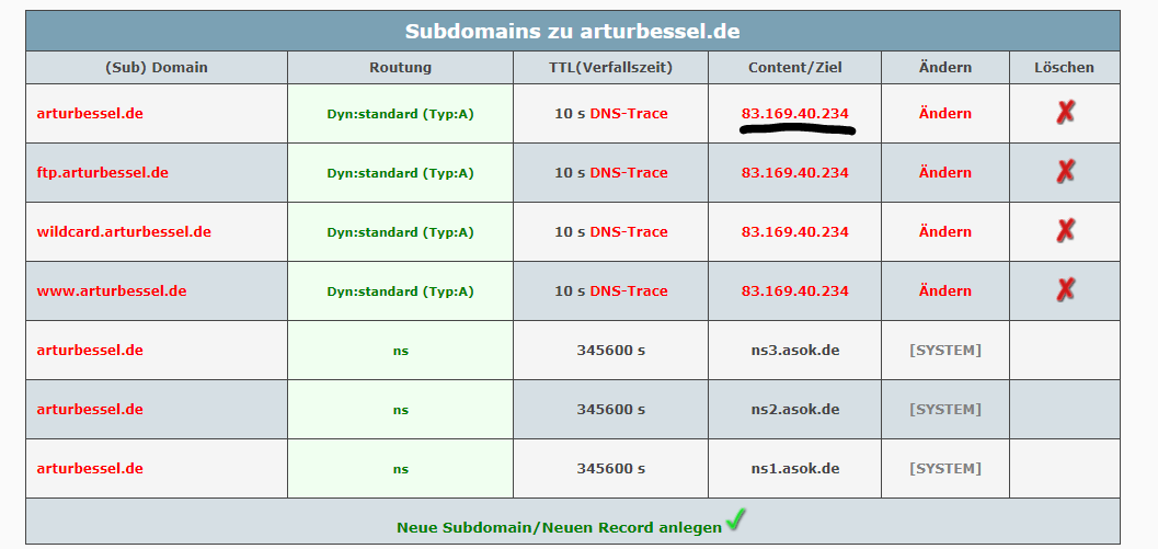 Allerdings schaffe ich es nicht, den dynDNS-Anbieter (selfost.de) derart einzurichten, dass die Domain (www.arturbessel.de) auf meine FritzBox und letztlich auf den dort angeschlossenen Server (RaspBerryPi4) weiterleitet.