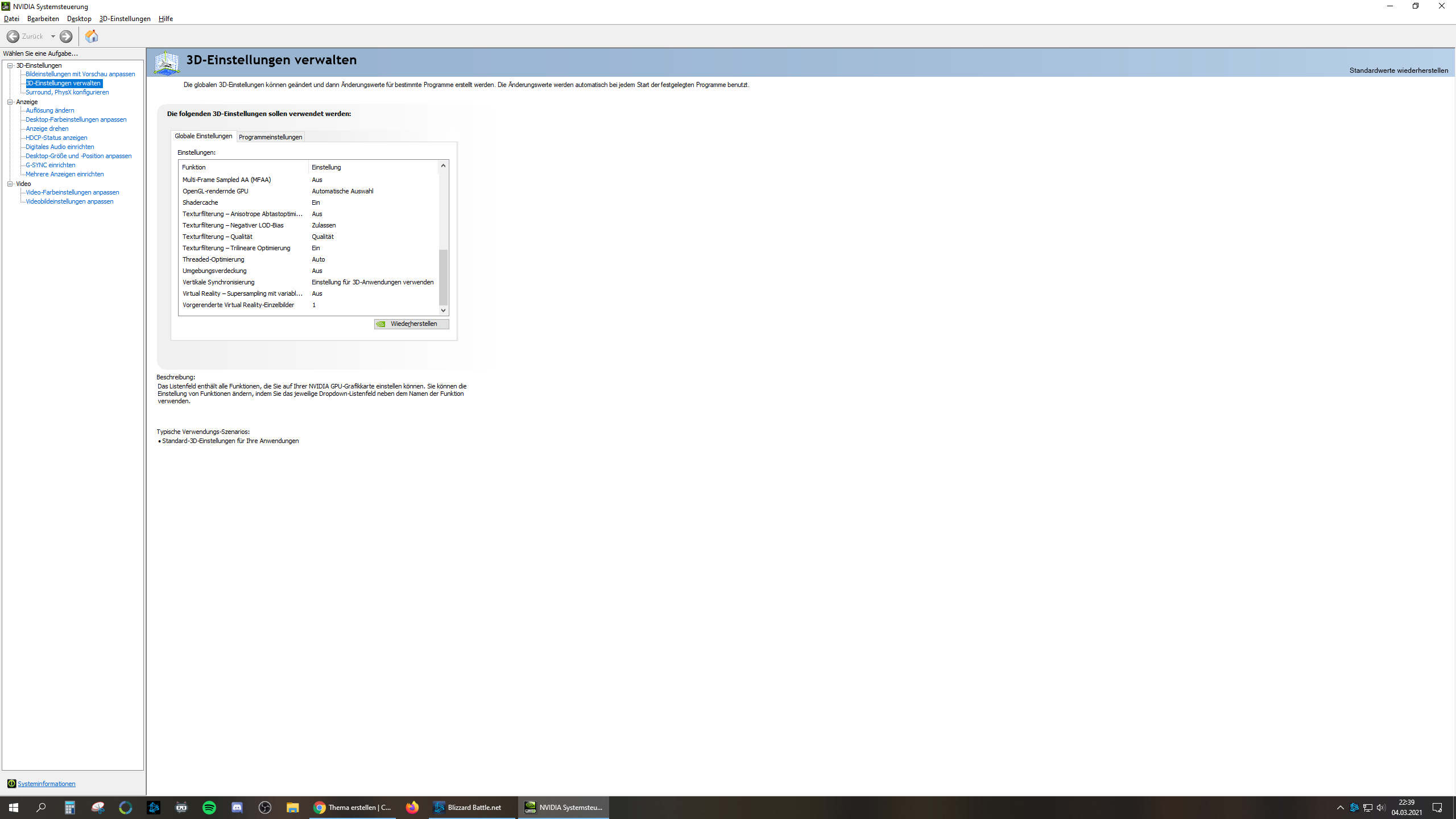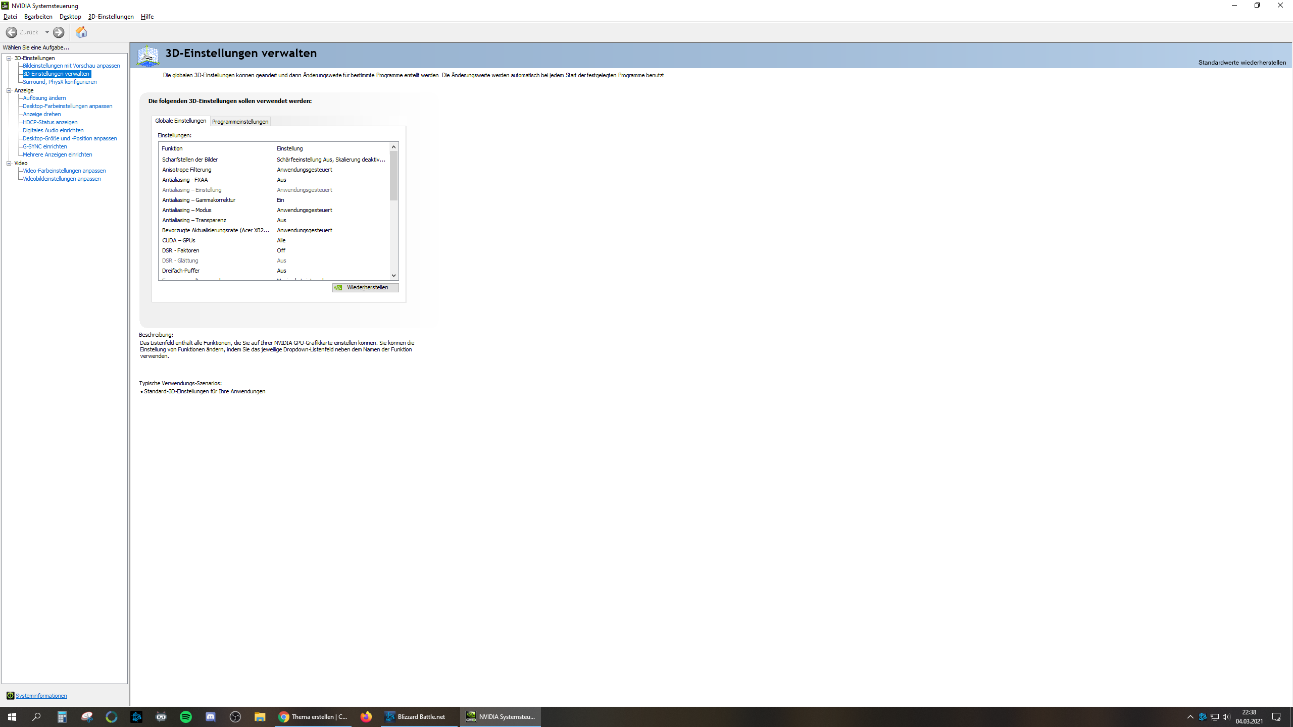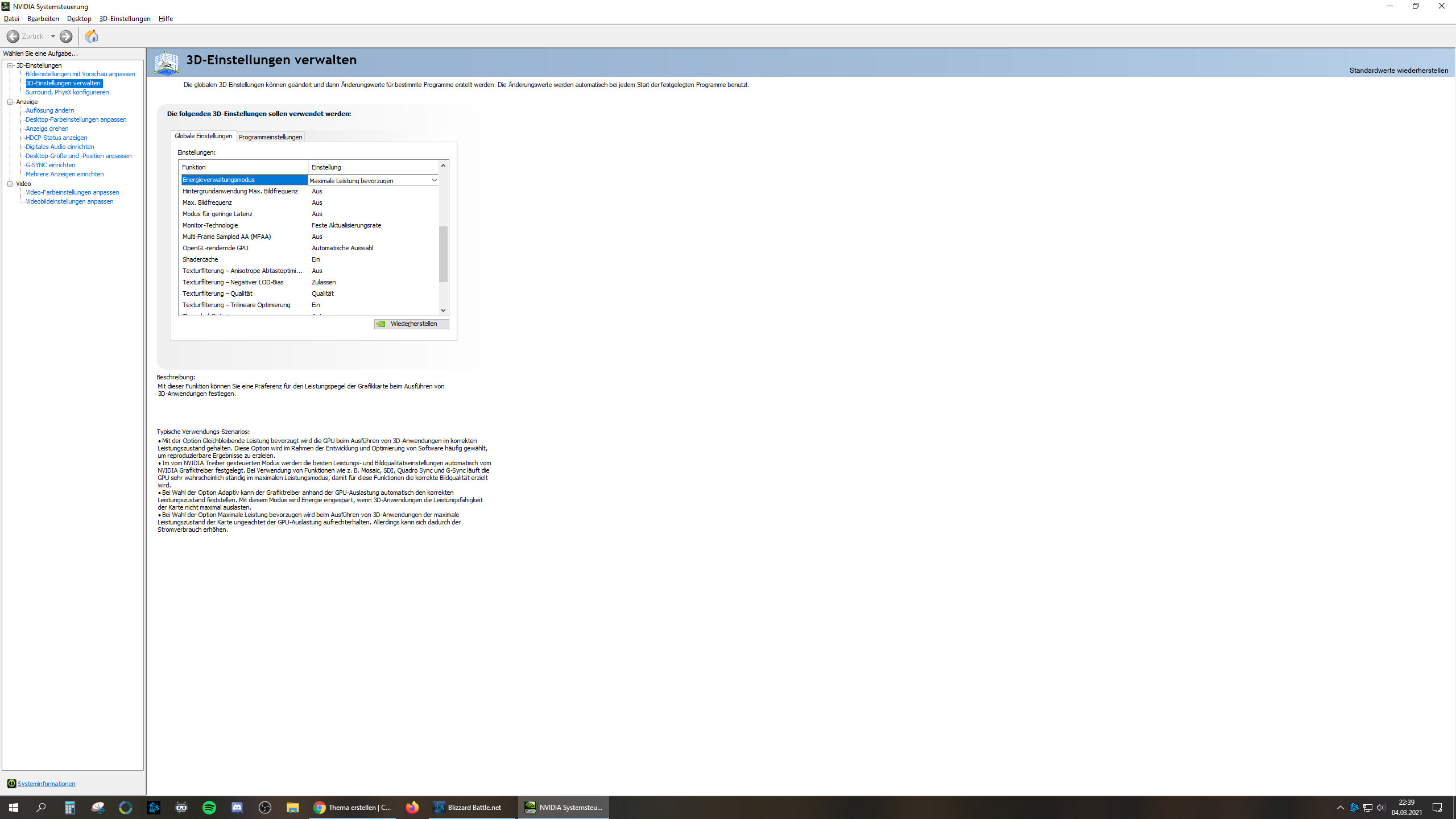 - In den 3D Einstellungen bei der Energieverwaltung auf "Maximale Leistung bevorzugen" umgestellt
