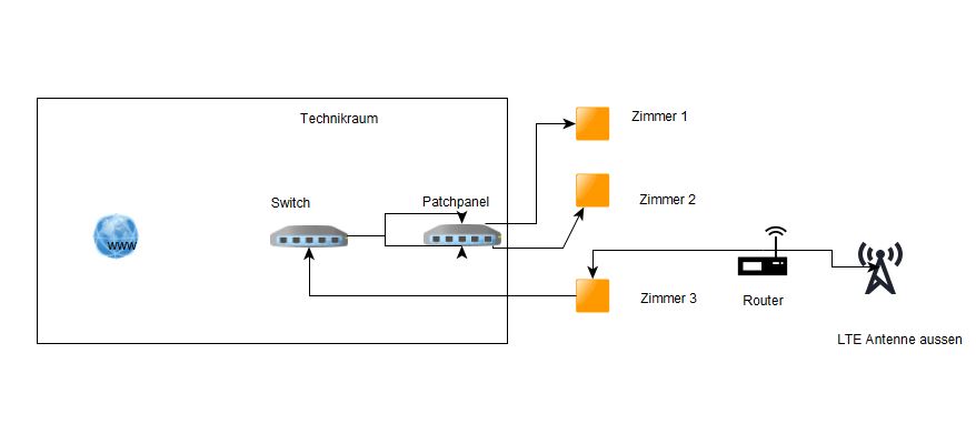 Über die Netzwerkdose ging es in den Technikraum auf einen Switch und weiter über das Patchpanel in die div. Räumlichkeiten.