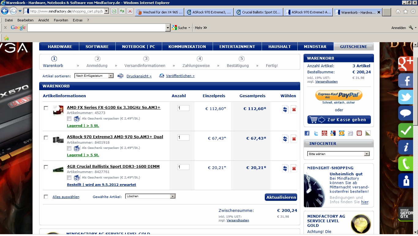 Und schließlich will nicht jeder OCen. Bei mir als Elektroniker streuben sich sowieso die Nackenhaare wenn Unkundige ein elektronisches Bauteil auf gut Glück außerhalb der Spezifikation betreiben. Aber selbst wenn Du den FX8150 nimmst und nur 100€ dafür zahlst, um mit viel OCen auf den Bereich eines nicht übertakteten i5-3570k zu bringen, wäre all der Preisvorteil dahin für den besseren DDR3-2133 Speicher und eine entsprechende Kühlung die man dafür bräuchte. Und der i5-3570K würde lauwarm mit Boxed-Kühler über diesen Hitzkopf von AMD nur müde lächeln, der verzweifelt versucht nicht den Anschluß zu verlieren.
