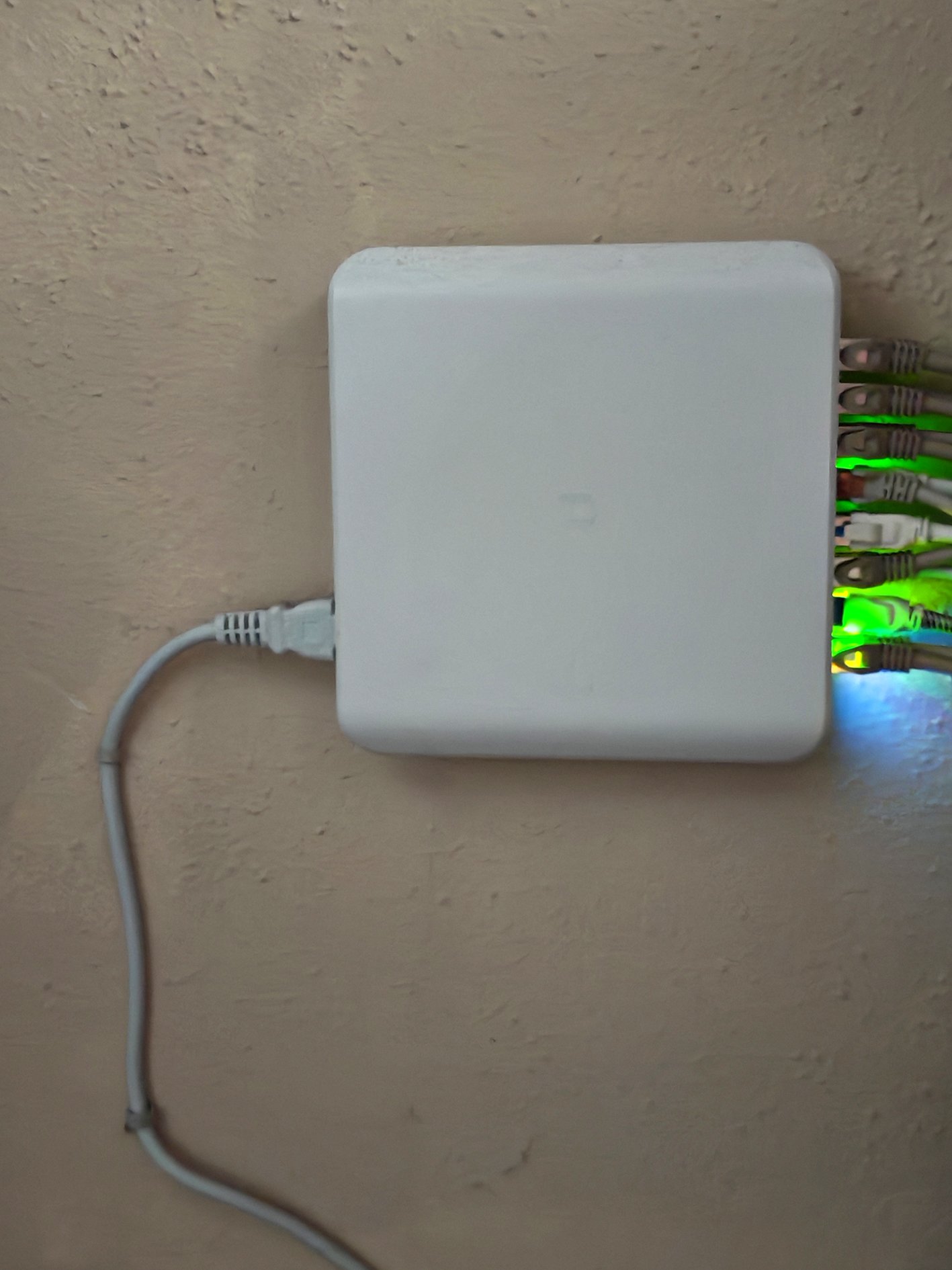 Ich wohne in einem Einfamilienhaus, dessen Netzwerk ich vor zwei Jahren grundlegend erweitert habe. Ich habe die „offensichtlichen” LAN-Kabel von der Wand ins nächste Zimmer entfernt und neue CAT8-Kabel unter den Putz gelegt. In jedem der vier Zimmer habe ich zwei LAN-Kabel verlegt. Am Ausgangspunkt habe ich die Kabel in einem Patchpanel gesammelt, das wiederum im kurzen Abstand zum Switch geht (siehe Bild). Switch Lite 16 PoE von Unifi.
