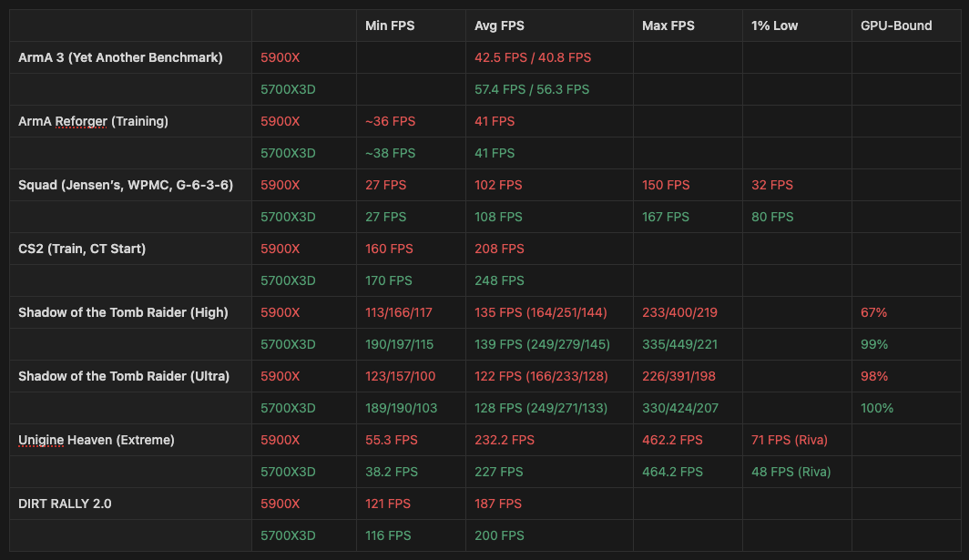In Simulationsspielen wie ArmA 3, Squad und auch in CS2 sehe ich einige FPS zugewinne und vor allem viel weniger niedrige Framerates. Beim 5900X waren es teilweise echt arge Ruckler, weil die Framerate ganz kurz einbricht. Mit dem 5700X3D ist es viel besser, es hilft dir aber nur die Framerate zu stabilisieren, nicht unbedingt für mehr Frames.