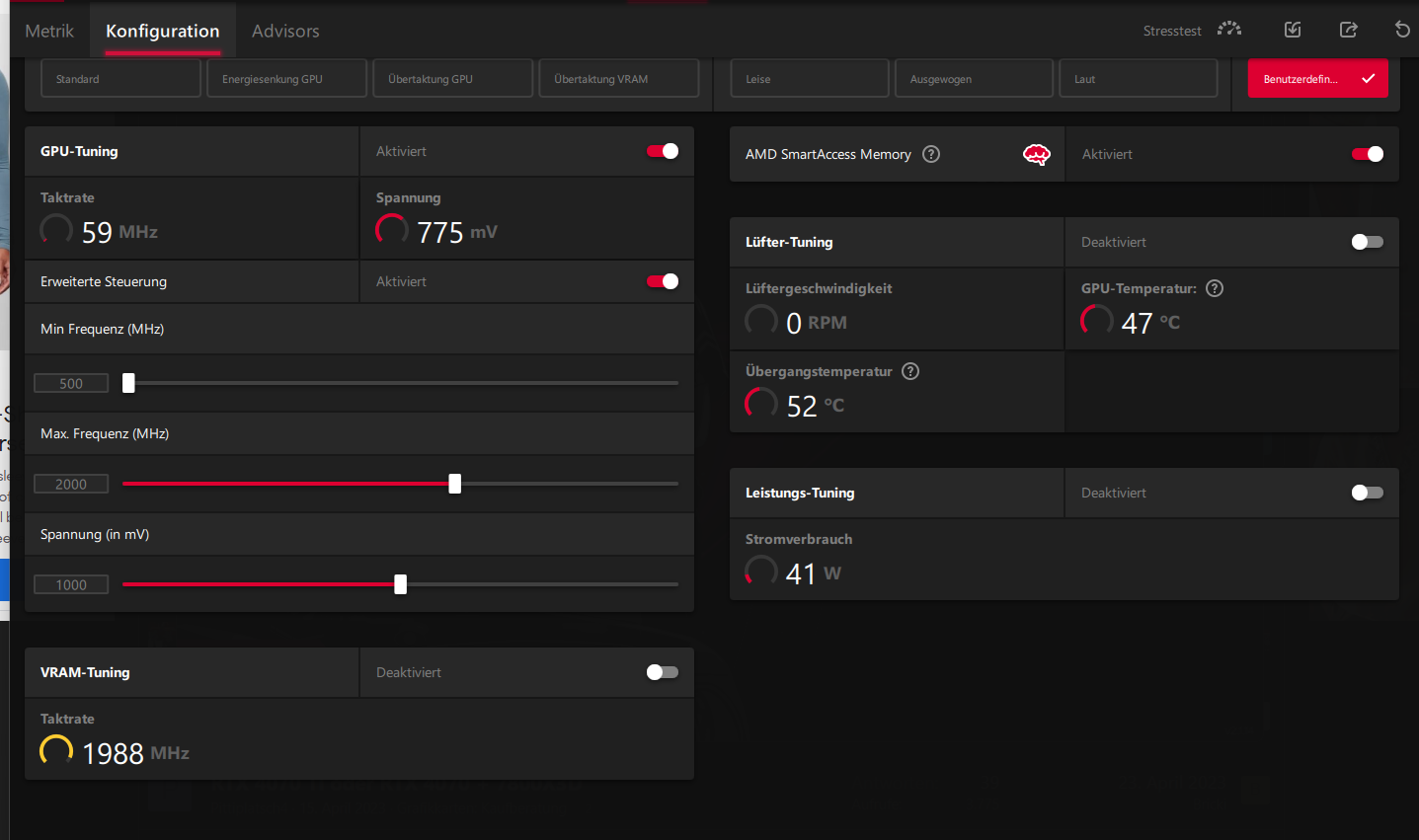 Meine RX 6800 macht stock keine 2.3GHz..nicht mal max in der Spitze (ohne Eingriff). Geschweige denn 2.6GHz.syfsyn schrieb:Was Taktraten bei rdna2 angeht nun das schwankt von Auslastung abhängig gemäß amd Philosophie Takt bis