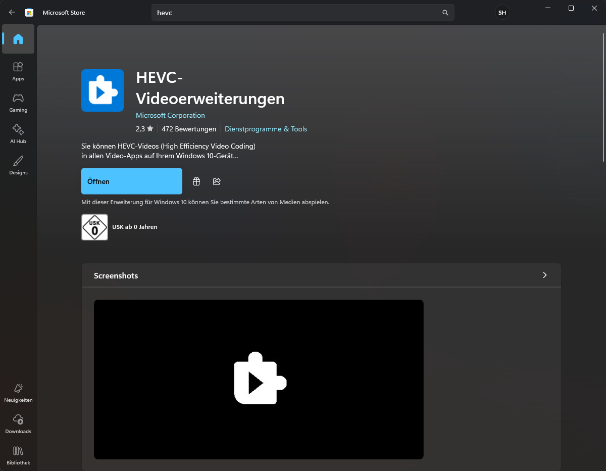Bis jetzt gerade nahm ich an, dass man sich einfach eine HEVC-Lizenz für 99 Cent kaufen kann, die man sowohl für Hardware-, als auch für Software-De- und Encoding braucht. So musste ich es auch bei meinem Desktop-Rechner (einmalig) machen, und es funktioniert prima!