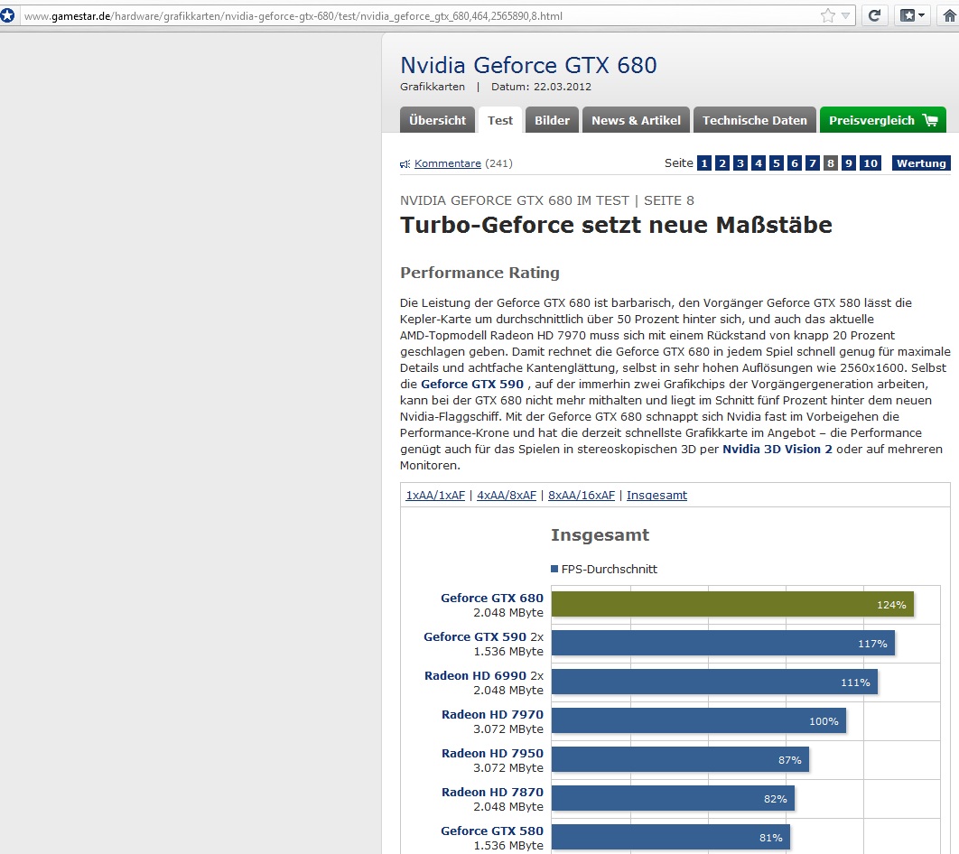 Bin der Meinung es sind ca. 10% jedoch ist die 680 von der Leistung im Schnitt stärker (und insgesamt ein leicht besseres Gesamtpaket). Wenn nicht in Full HD gespielt wird ist eine sicher 7970 eine gute Alternative. Sagen wir so hätte meinen wohl Post noch genauer differenzieren sollen mit: "...könnte 7970 die bessere Alternative werden."Numrollen schrieb:Die 7970 ist die Alternative. Man muss nicht immer CB oder Gamestar Benches nehmen. Gibt viele Seite bei der der FPS Durchschnitt bei ~20 Games insgesamt Gleichstand bescheinigt. BF3 ist 680 vorne und 1-2 andere, gibt aber genau andersrum Games mit aktuellen Treibern in der die 7970 davon zieht. Die hier immer bescheinigten 16% Vorsprung (oder wieviel waren es) stimmt nicht global gesehen.