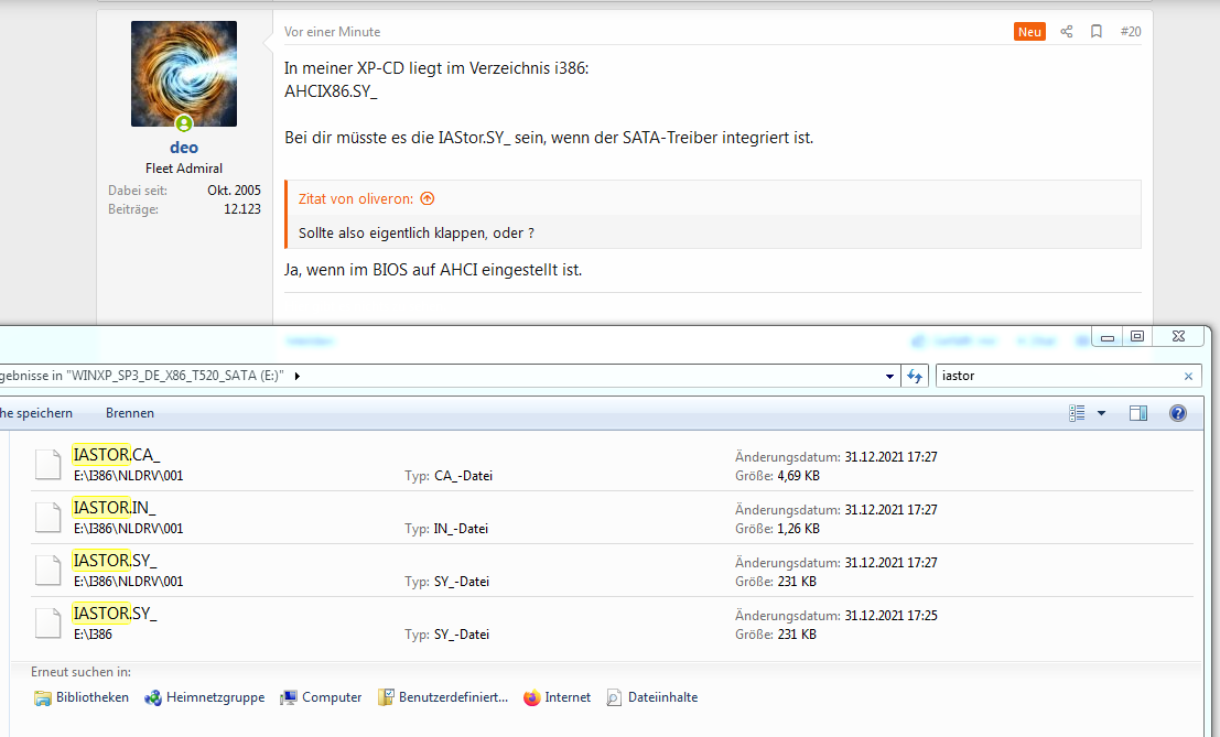 @oliveron Mit der Integration der Treiber von Lenovo, die du verlinkt hast, sollte die Installation von Windows XP schon klappen. Die Treiber passen für die Intel 6 Series Chipsätze und Version 11.2.0.1106 ist die neueste Version, die von Intel für XP unterstützt wird. Da brauchst du keine modifizierten Treiber. Man sieht in deinen Screenshots auch, dass das die SATA Disketten-/F6-Treiber sind, weil die TXTSETUP.OEM dabei ist.