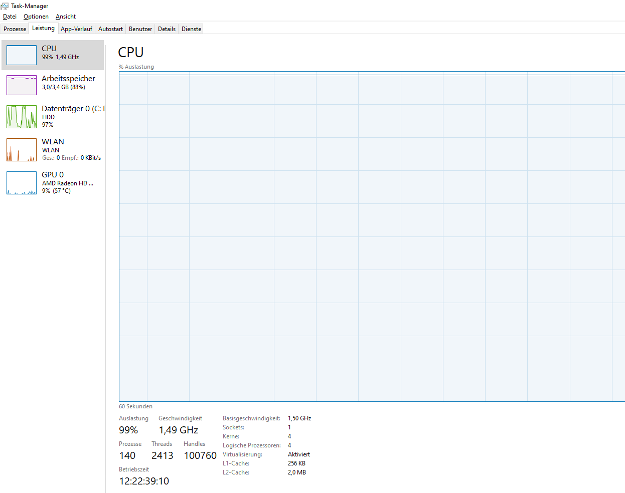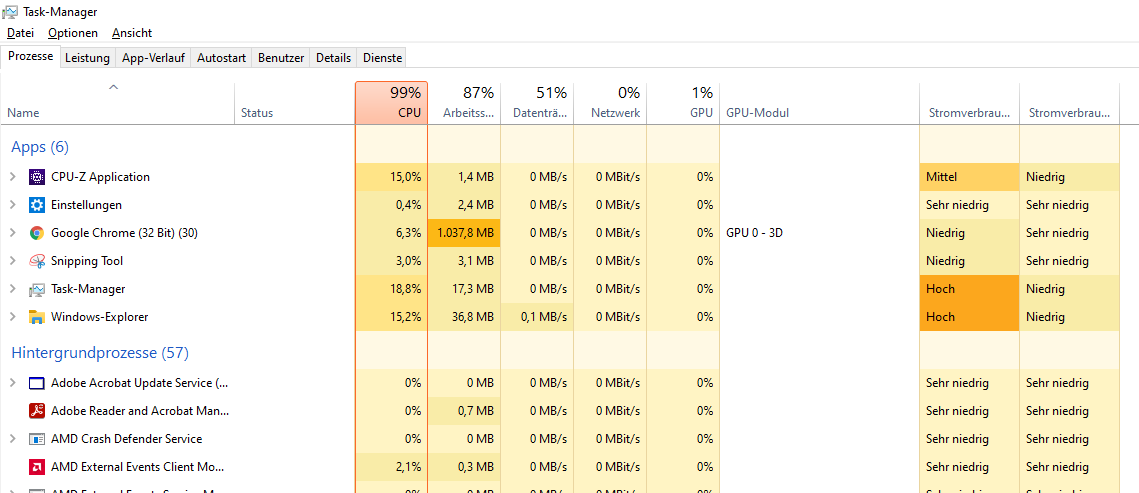 Mein Rechner (Windows 10) ist übel langsam geworden und reagiert teilweise in Faultier-Geschwindigkeit, egal, was ich gerade mache ... Der Task-Manager zeigt mir durchweg eine CPU-Auslastung in Höhe von 99%.