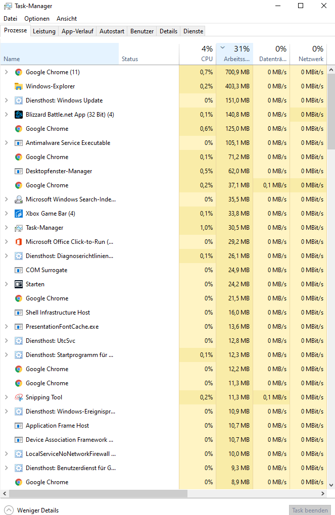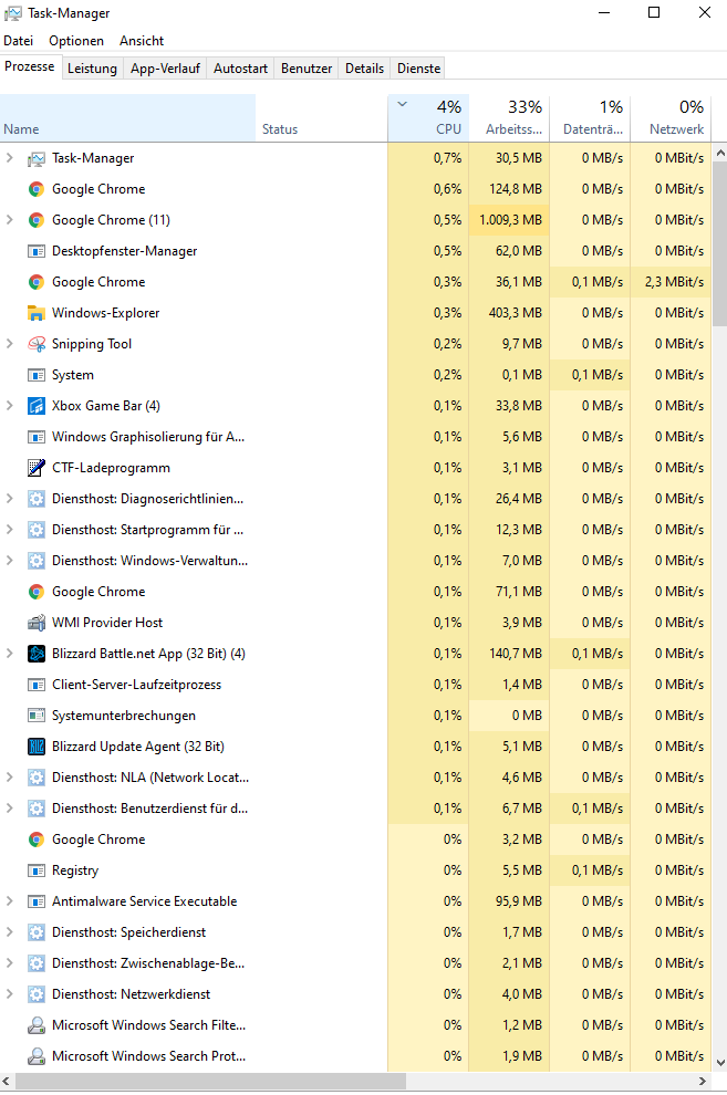 Ich bin leider komplett Ahnungsloser im IT-Bereich und auf eure Hilfe angewiesen. Ich schaue regelmaessig in den Taskmanager, wenn ich das Gefühl habe das irgendwie etwas nicht reibungslos läuft, aber darüber hinaus hört mein Know-how leider schon auf weil ich auch mit Google zusammen nicht wirklich schlau daraus werde was für was da ist und gebraucht wird..