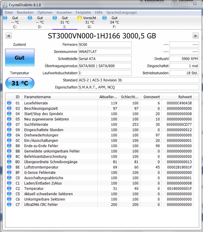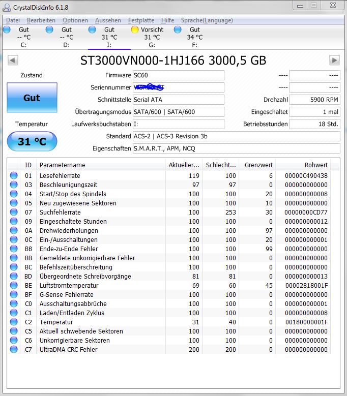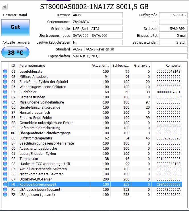 Nein und die hat auch gar keine Lese- oder Suchfehler. Die Rohwerte zeigen bei den Seagate bei u.U. den beidden Attributen nämlich mehr als einen Zähler an. Die ersten 2 Bytes links im Rohwert (hier jeweils 4 Nullen) sind die Anzahl der Fehler, hier also keine Fehler, und die anderen 4 Byte (8 Stellen dahinter) sind die Anzahl der Lese- bzw. Suchvorgänge und das die bei der Nutzung der HDD zunehmen, dürfte einleuchten.Depp_vom_Dienst schrieb:Ist es normal, dass die Platte schon von Anfang and Such- und Lesefehler hat ?