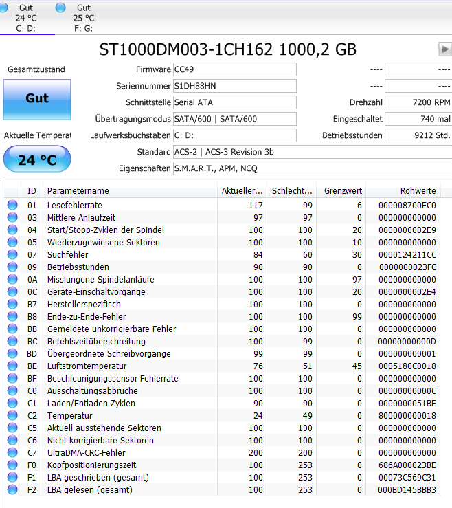 Was ist eine Reaktionszeit? Es gibt nur Zugriffszeiten, ja Zeiten und nicht nur eine Zugriffszeite, denn es beginnt bei Track-to-Track und geht bis Full-Stroke (von ganz innen nach ganz außen oder umgekehrt) und meist wird die mittlere Zugriffszeit angegeben, die eben irgendwo dazwischen liegt. Hier werden also offenbar Äpfel und Birnen vergleichen, wenn eine Platten mit 4,2ms angegeben ist und eine ähnliche mit gleicher Drehzahl mit 8,9ms. Vergiss das also einfach, die Zugriffszeit hängt vor allem von der Drehzahl ab, da nach dem Bewegen der Köpfe immer noch statistisch eine halbe Umdrehung vergeht, bevor der gesuchte Sektor dann auch unter den Köpfen auftaucht.Nova eXelon schrieb:die als Reaktionszeit nicht die üblichen 8.9ms angegeben haben, sondern zB 4.2ms.