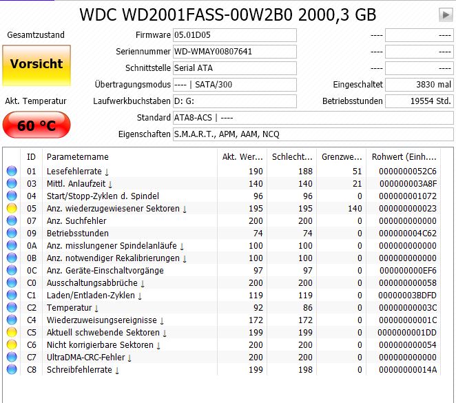 Poste doch bitte mal den Screenshot von CrystalDiskInfo für die Platte, ziehe aber bitte das Fenster soweit auf, dass alle Attribute und auch die Rohwerte vollständig sichtbar sind.