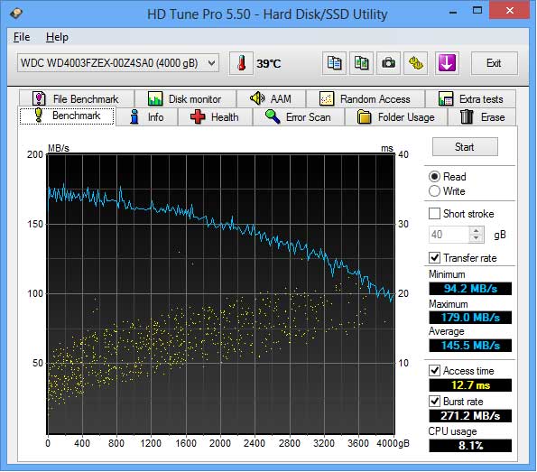 Das Datenblatt sagt "Host to/from drive (sustained) 171 MB/s", passt also gut mit dem Maximalwert und der Minimalwert ist mit ungefähr 100MB/s (die Zacken mal rausgerechnet) zu hoch, da wird Short Stroke betrieben, die 4TB Black hat also sicher 5 Plattern.