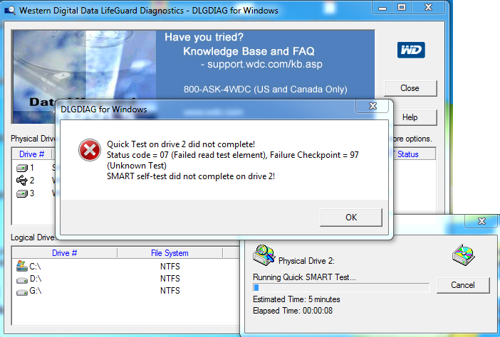 Status Code = 7 (Failed read test element), Failure Checkpiont = 97