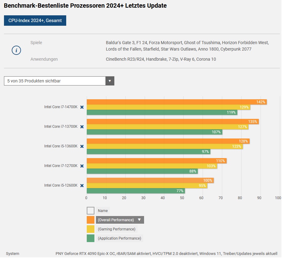 Wenn man bei der vorhandenen Plattform bleiben möchte, mĂŒsste man schon fast zum 14700K greifen. Leider hat die PCGH in ihrem Index keinen 14600K mit drin. Und ob bei Hunt Ă€hnliche Steigerungen drin sind, weiĂ ich nicht. Find auf die Schnelle nichts Passendes dazu. Aktuell liegt der um die 370 Euro. Der 12600K geht auf Ebay ganz grob ab 120 Euro weg. Nur mal so zur Info wo Preislich die Reise hingeht.