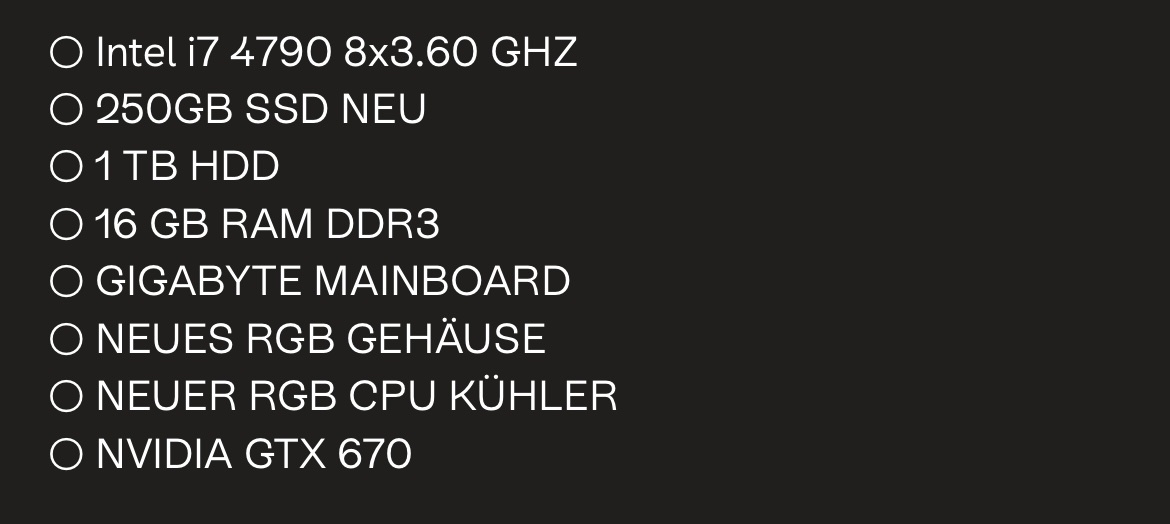 Hey unzwar habe ich mir ein neuen Pc zugelegt und würde gerne Gta rp spielen nur macht die Grafikkarte da nicht so ganz mit die ich grade drinnen habe deswegen wollte ich euch Experten mal nach einem rat beten welche könnte ich mir eventuell holen damit das Spiel genießbar ist wenn’s geht nicht all zu teuer ^^ anbei die Sachen die grade in meinem pc verbaut sind