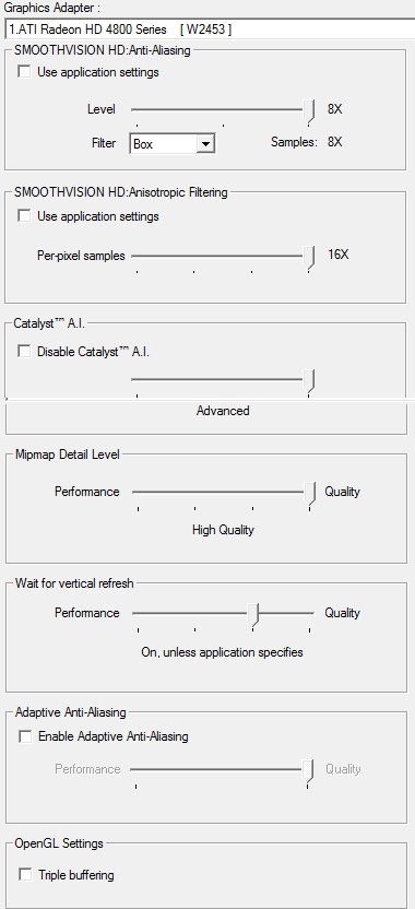 sry, muss nochmal fragen, hier meine ingame einstellungen und im anhang die vom treiber. is das so ok, oder kann ich noch was verbessern? was ist das mit dem adaptive AA? und muss ich dann ingame AA ausstellen oder summiert sich das bzw. wird es vom treiber überschrieben?