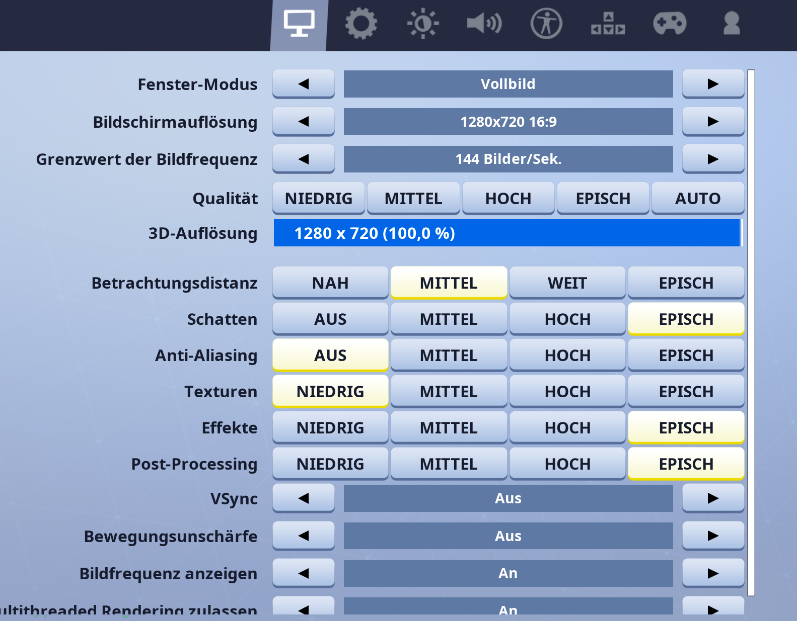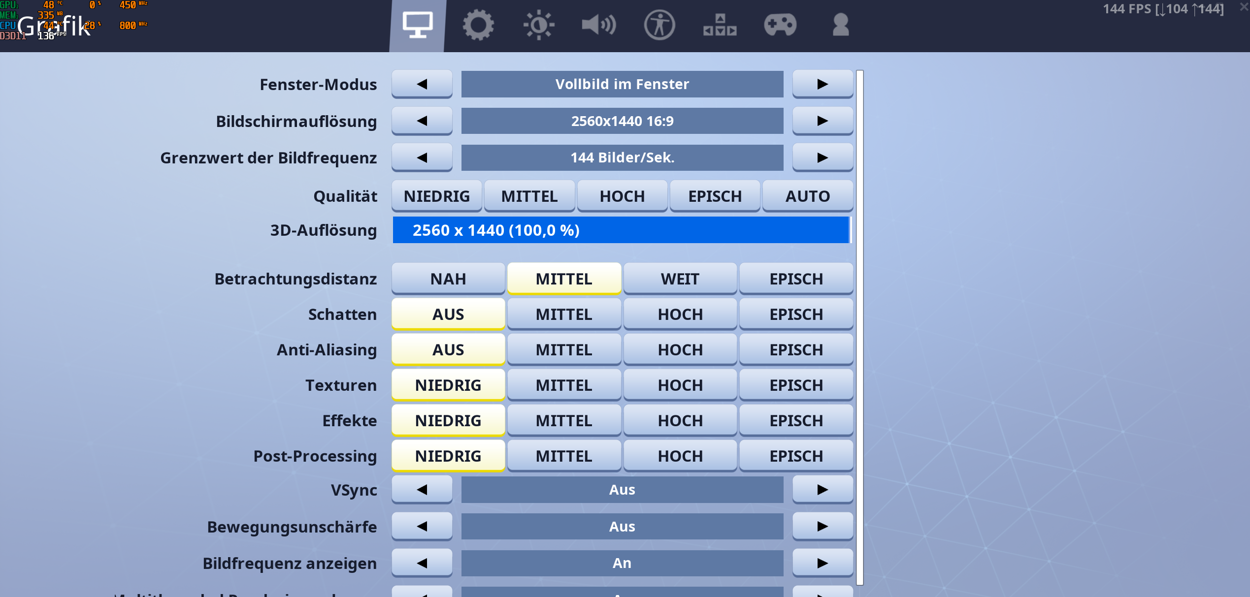Auflösung, Anti-Aliasing, Ambient-Occlusion und Textur-Auflösung auf Minimum. Rest so lassen wie er ist.