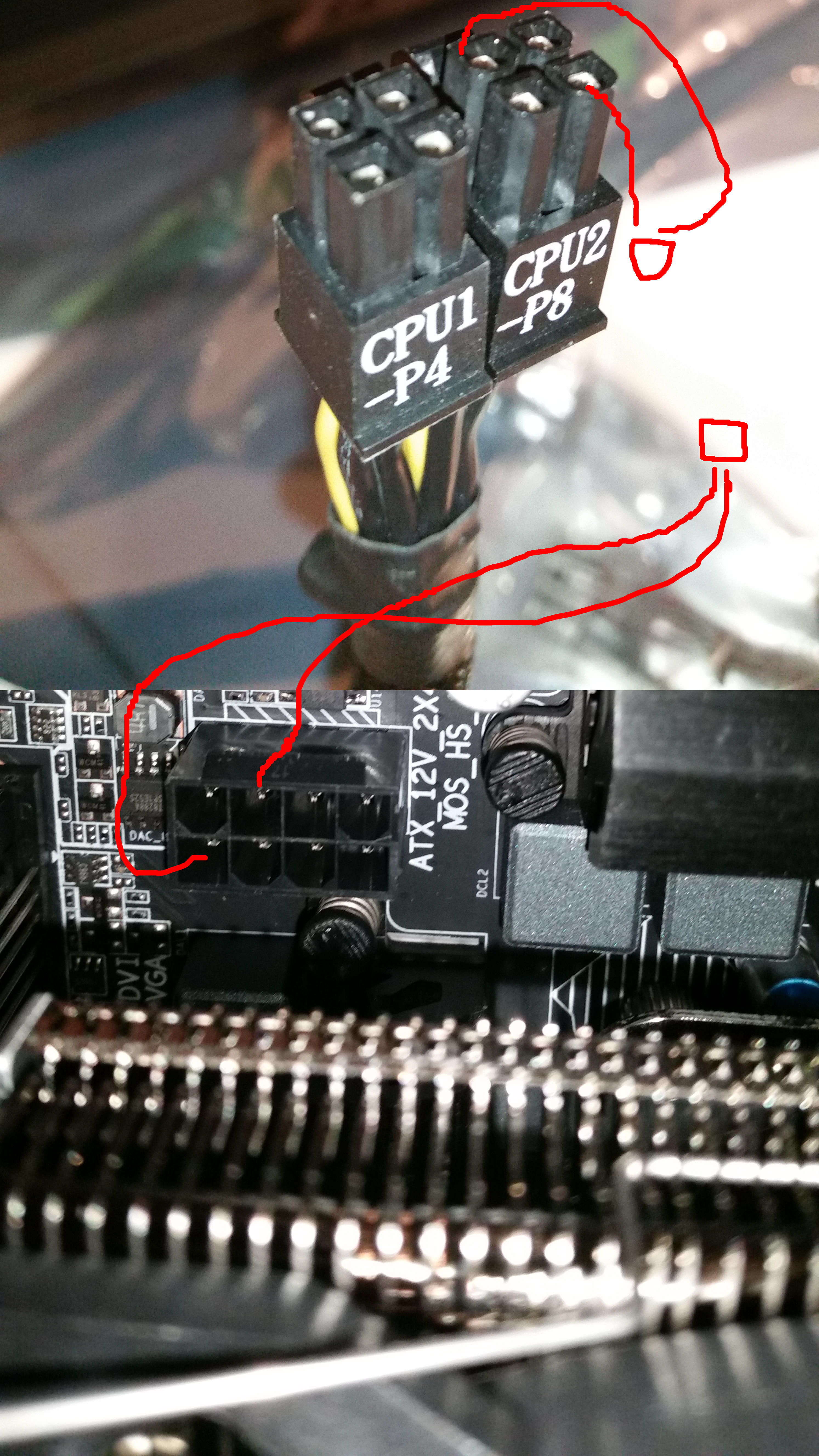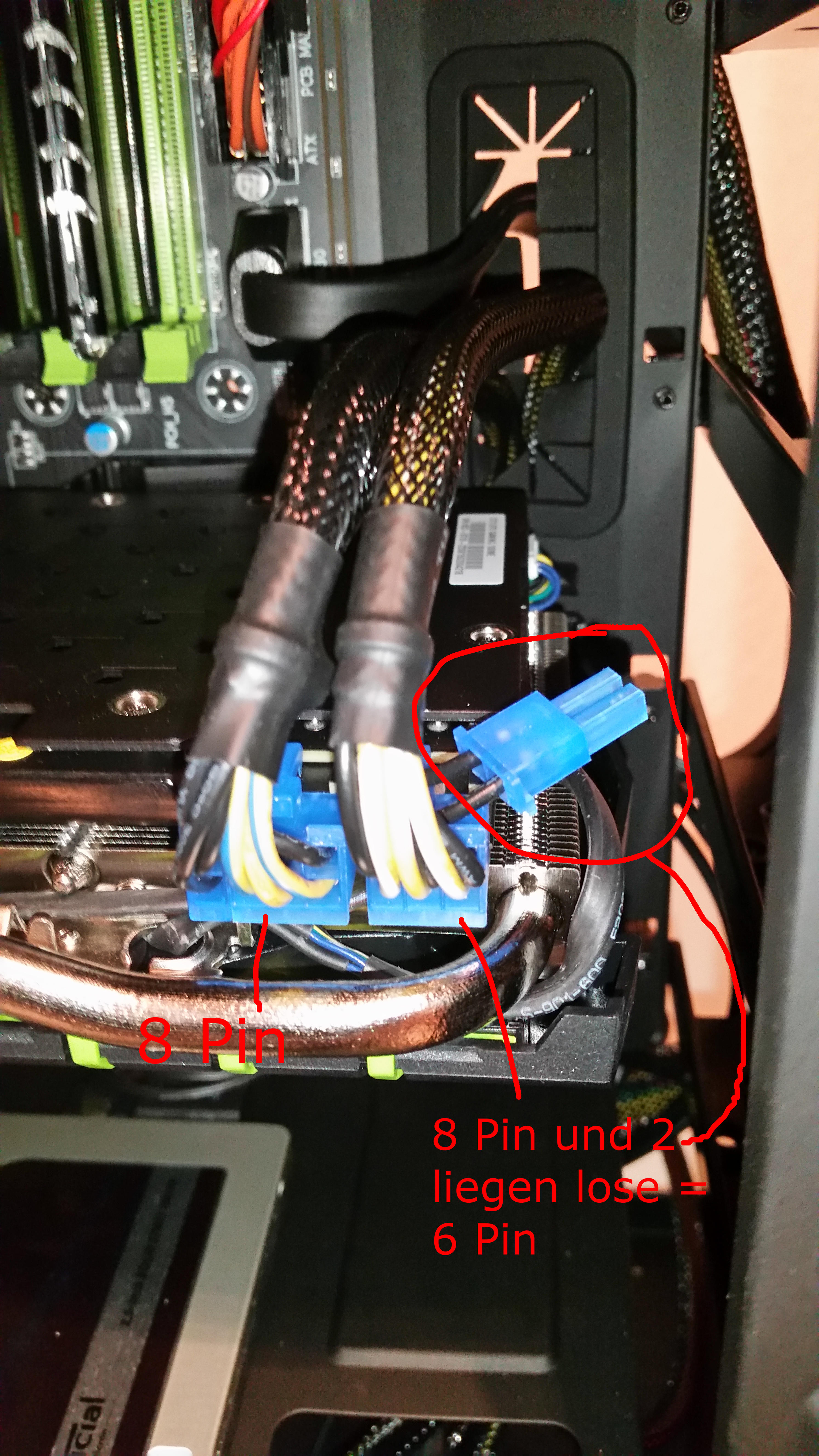 Hier hatte der Stecker für die zusätzliche Stromversorgung (8 Pin, siehe Bilder davor) an zwei Stellen nicht die richtige Einkerbung, passt aber trotzdem 100%. Kann ich den einfach so Stecken lassen, oder brauche ich ein anderes Kabel?