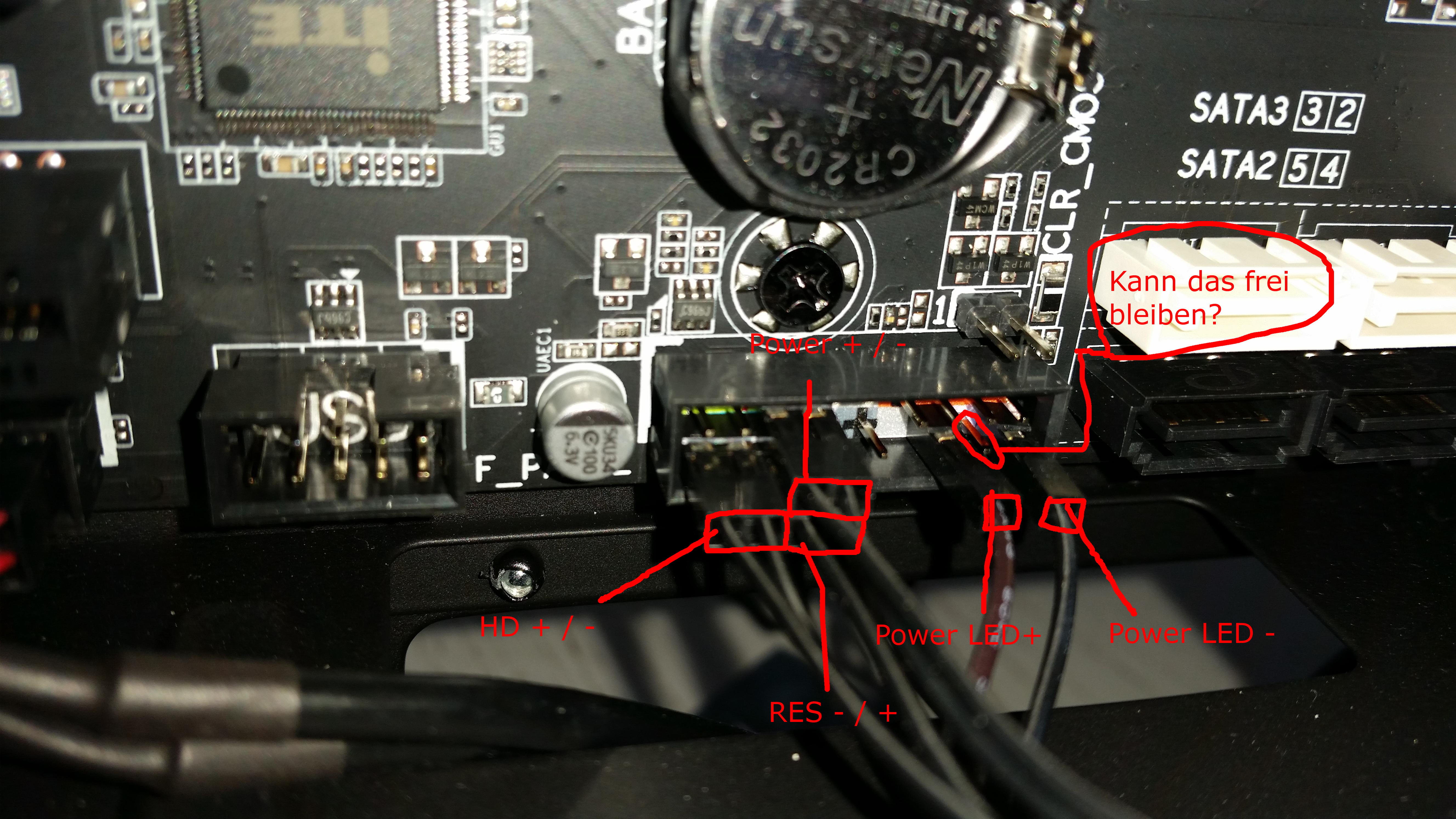 Hier würde ich gerne wissen, ob ich beim Panel alles korrekt angeschlossen habe, abgesehen davon, dass ich keinen Speaker habe. Es gab zwei Minuspol-Anschlüsse für den Power LED Stecker und ich habe den ganz rechts genommen und nicht den in der Mitte. Soll ich das ändern, oder kann das so bleiben?:
