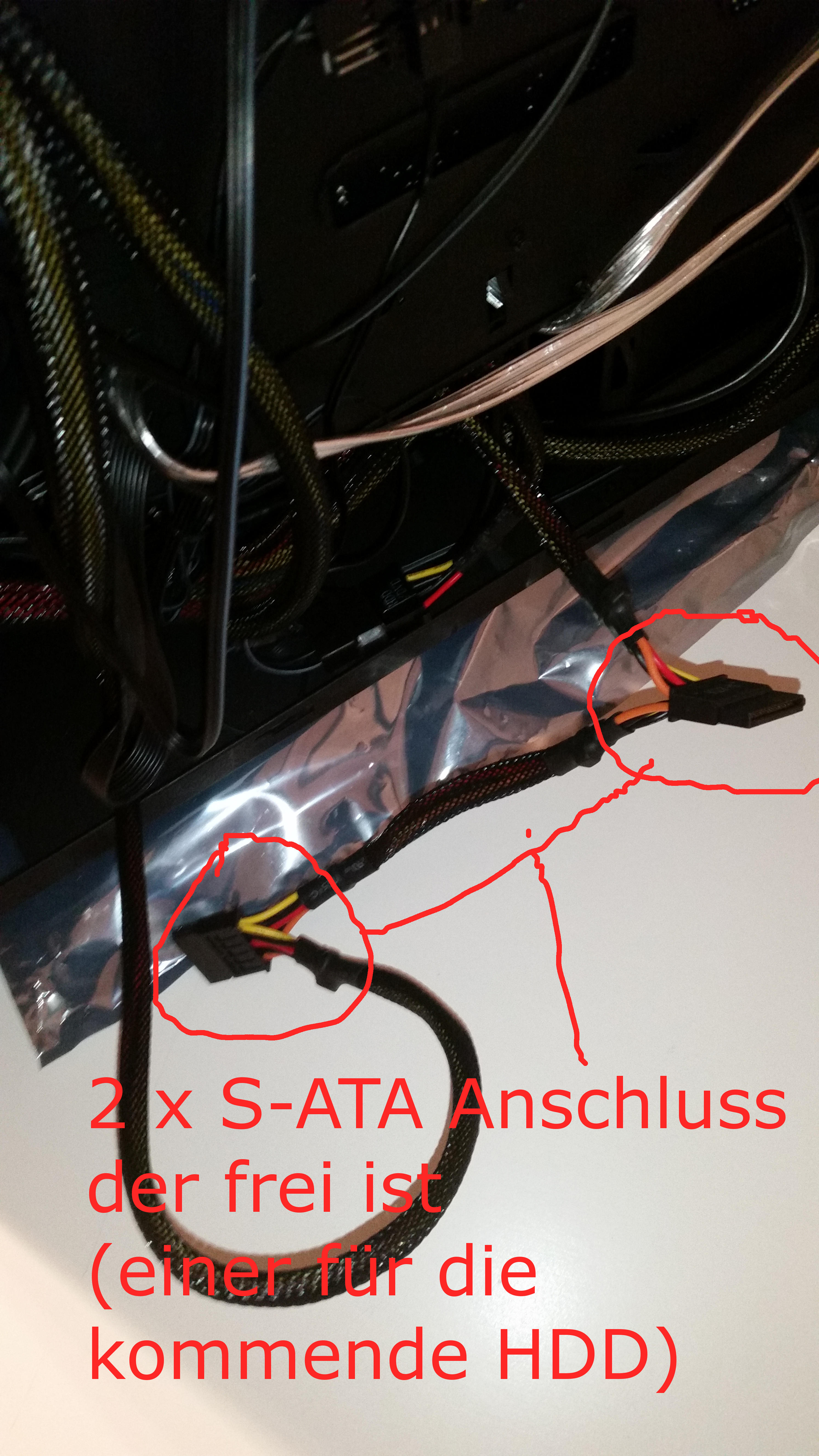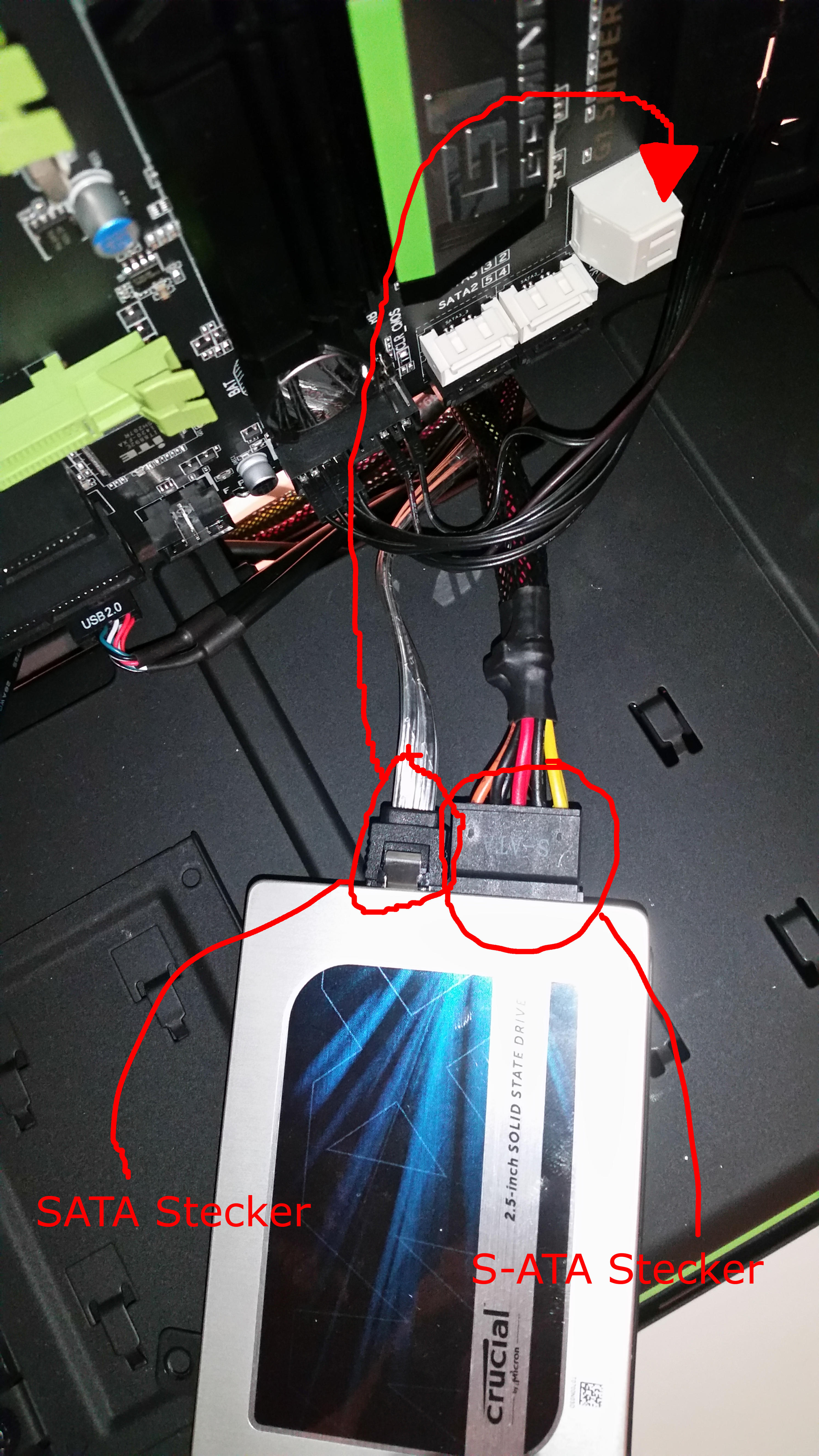 Hier habe ich die SSD mit einem Sata Kabel (mitgeliefert vom Mainboard) und einem S-ATA Kabel (mitgeliefert vom Netzteil, was auch schon ein paar Zeilen zuvor beschrieben wurd) verbunden und das Sata Kabel an den Sata 3 Steckplatz 1 gesteckt. Ist das alles so richtig?