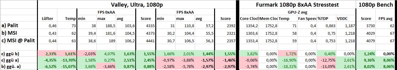 Erstmal subjektiv zur Lautstärke: Die Unterschiede sind ziemlich gering. Getestet wurde bei offenem Gehäuse aus 1m Entfernung mit einer Lautstärke der anderen Lüfter, wie sie im geschlossenen Gehäuse nicht zu hören wäre (offen dagegen schon minimal). Im Idle sind die Lüfter beider Karten aus. Unter Vollast (Temp und Lüfterspeed siehe Tabelle) war die MSI immer noch nicht heraushörbar, die Palit leicht zu hören. Spulenfiepen war bei 60FPS bei der MSI nicht hörbar, bei der Palit leise, aber nicht laut genug, als dass man es aus dem geschlossenen Gehäuse hören würde (Erfahrung durch Tests mit EVGAs). Ab 100 FPS konnte ich zwischen dem Spulenfiepen beider Karten in der Lautstärke nicht mehr unterscheiden, bei beiden war es geringfügig wahrnehmbar, allerdings immernoch so, dass es im Gehäuse bleiben würde. Erst im Highframebereich (getestet mit Beenden von Unigine Valley, da schnellen die FPS immer in die Höhe) wurde es stark wahrnehmbar bei beiden Modellen. Zum Glück hat man diese Situationen nicht so oft.