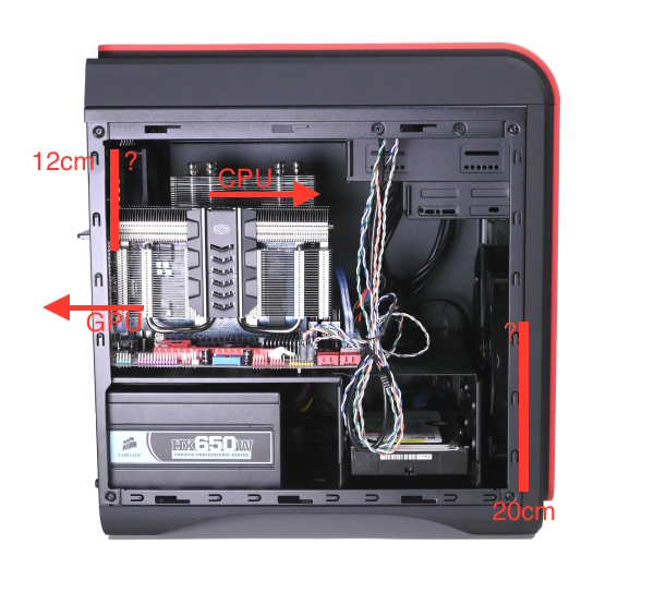 Die Frage ist, in welche Richtung lass ich den vorderen 20cm Lüfter und den hinteren 12cm Lüfter blasen/saugen?