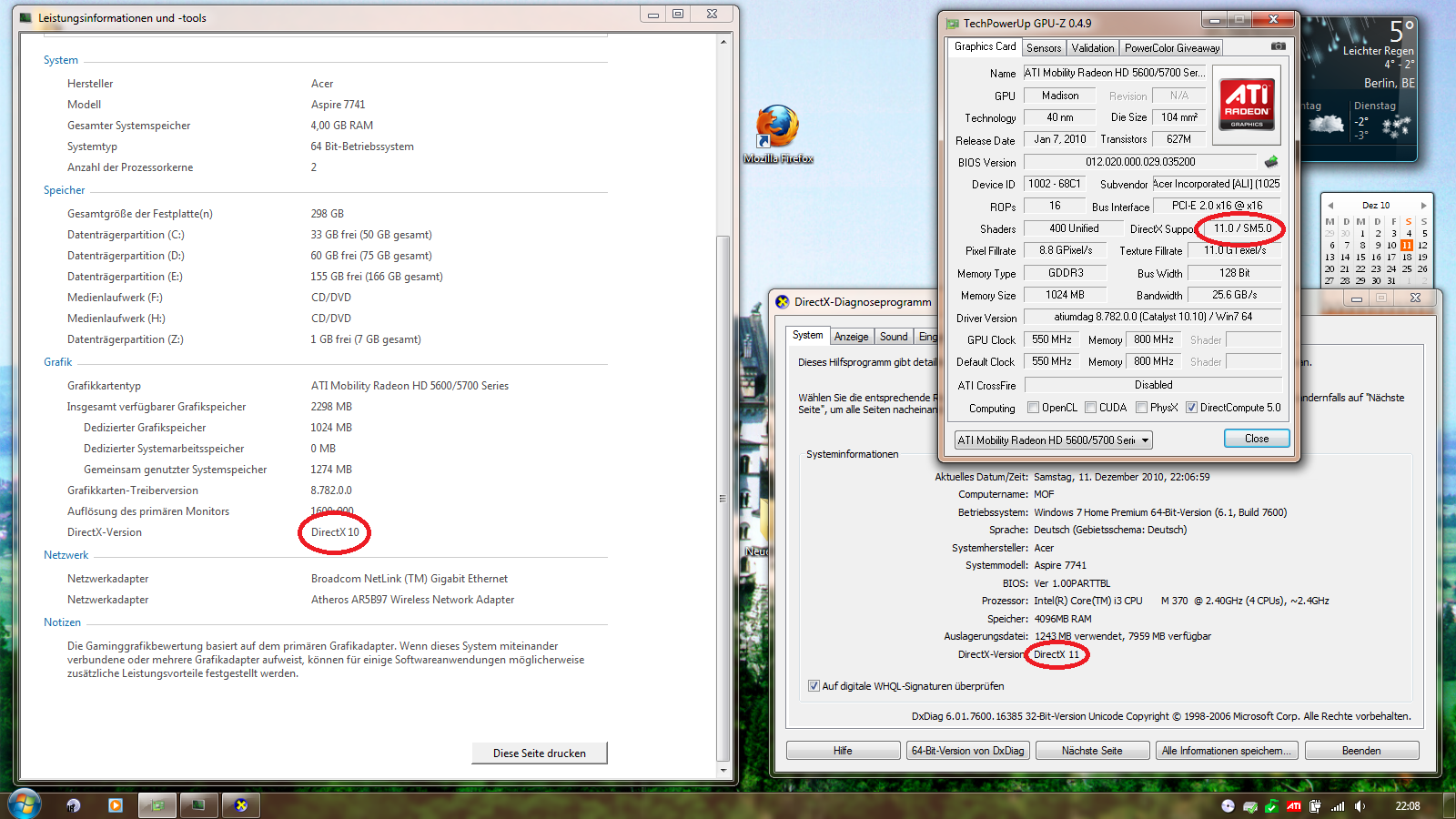 Ich besitze ein Notebook von acer das ASPIRE 7741G. Die installierte Grafikkarte ist eine ATI Mobility Radeon HD 5650. Laut Wikipedia hat meine Grafikkarte DirectX11-Unterstützung (Grafikchip: Madison/RV830).