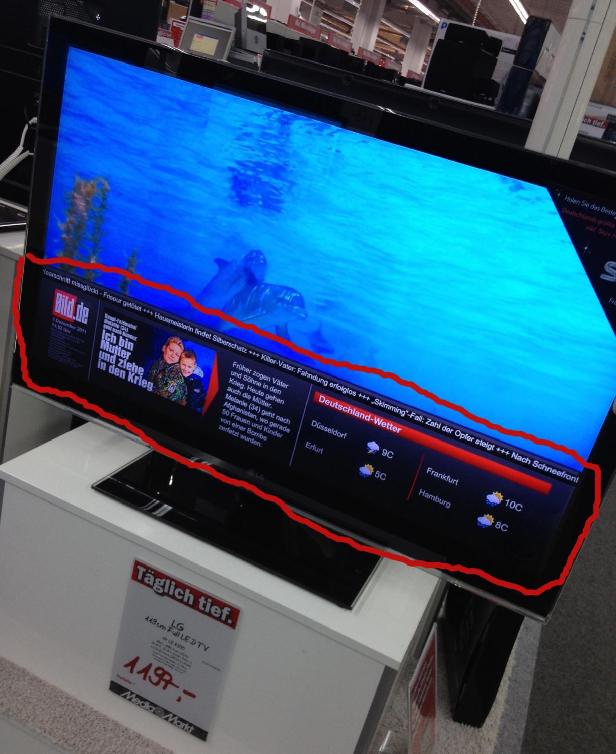 Ein Kumpel von mir war vor ein paar Tagen im MM und hat dort auf allen Fernsehgeräten gesehen, dass eine "Nachrichtenapp" hochgeklappt ist. Ich habe es mal auf dem Bild markiert. Allerdings weiß ich nicht, um welches System es sich handelt. Kumpel meinte, dass es nicht von dem LG-TV gekommen ist und bei allen TV-Geräten (auch von anderen Herstellern) (nahezu) gleichzeitig passiert ist. Er findet es ziemlich cool und hat mich gefragt, ob ich wüsste, was das ist.
