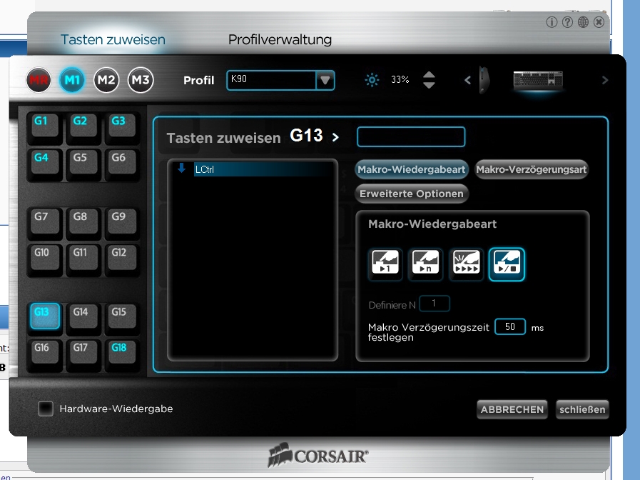 Ja siehe Bild am Beispiel der K90. Es wird in dem Fall die STRG Taste als Macro aufgezeichnet ABER du lässt die Taste NICHT los, sondern beendest die Aufzeichnung. Gleichzeitig wird die Option (Rechts - Mitte der 4te Button) ausgewählt das der Druck der Taste dieses Macro startet und es AKTIV (da kein loslassen der Taste aufgezeichnet wurde) hält bis diese G-Taste ERNEUT gedrückt wird. Natürlich könnten nach dem drücken und gedrückt halten der STRG Taste noch weitere befehle mit oder ohne Verzögerung eingegeben werden.