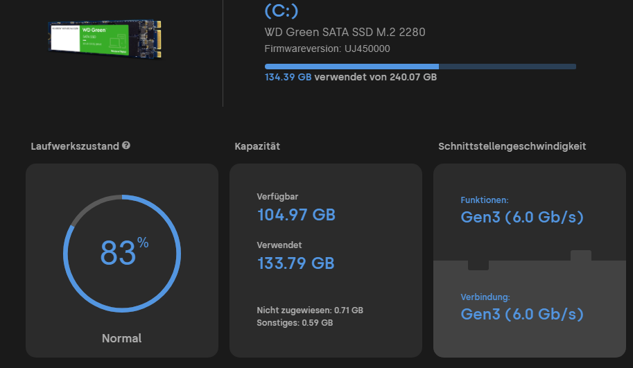 Eigentlich möchte ich mir einen kompakten MiniPc (mind. R9) in den nächsten 2 Jahre kaufen, aber bis dahin sollte ich wohl mein Hauptlaufwerk, auf dem Win 11 Pro und alle Anwendungen installiert sind, tauschen um meinen aktuellen Rechner noch gut verwenden zu können. Hier ist wohl der Flaschenhals und mit wenig Geld bekomme ich noch einmal einen kleineren Leistungsschub um mein Board auch maximal auszunutzen. Außerdem ist der Verschleiß nun bereits bei 83% angelangt. Diese WD Green SSD M.2 2280 ist eben auch schon 6 Jahre alt…. Man merkt es ihr an. Außerdem ist sie wirklich wohl ein blöder Flaschenhals in meinem ganzen System.